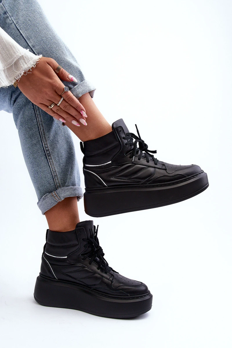 Moderní dámské sportovní boty vyrobené z přírodní kůže. Vsazené na masivní platformě. Kotníková část. Zaoblené špičky. Model s klasickým šněrováním. Ideální na jarní dny! Tento střih se vám jistě zalíbí! Při výběru velikosti se řiďte tabulkou velikostí.