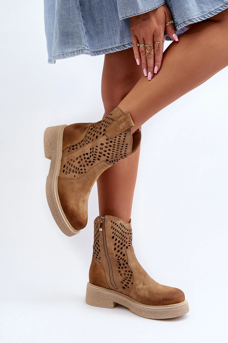 Moderní a pohodlné boty jsou skvělou volbou na každou příležitost. Vyrobené z přírodního semiše. Perforovaný svršek přidává eleganci a lehkost, zdůrazňující původní styl. Díky zipu je snadné je obout a přizpůsobit noze. Zaoblené špičky zajistí pohodlnost nošení. Tyto boty budou ideálním doplňkem různorodých stylizací! Při výběru velikosti se řiďte tabulkou velikostí.