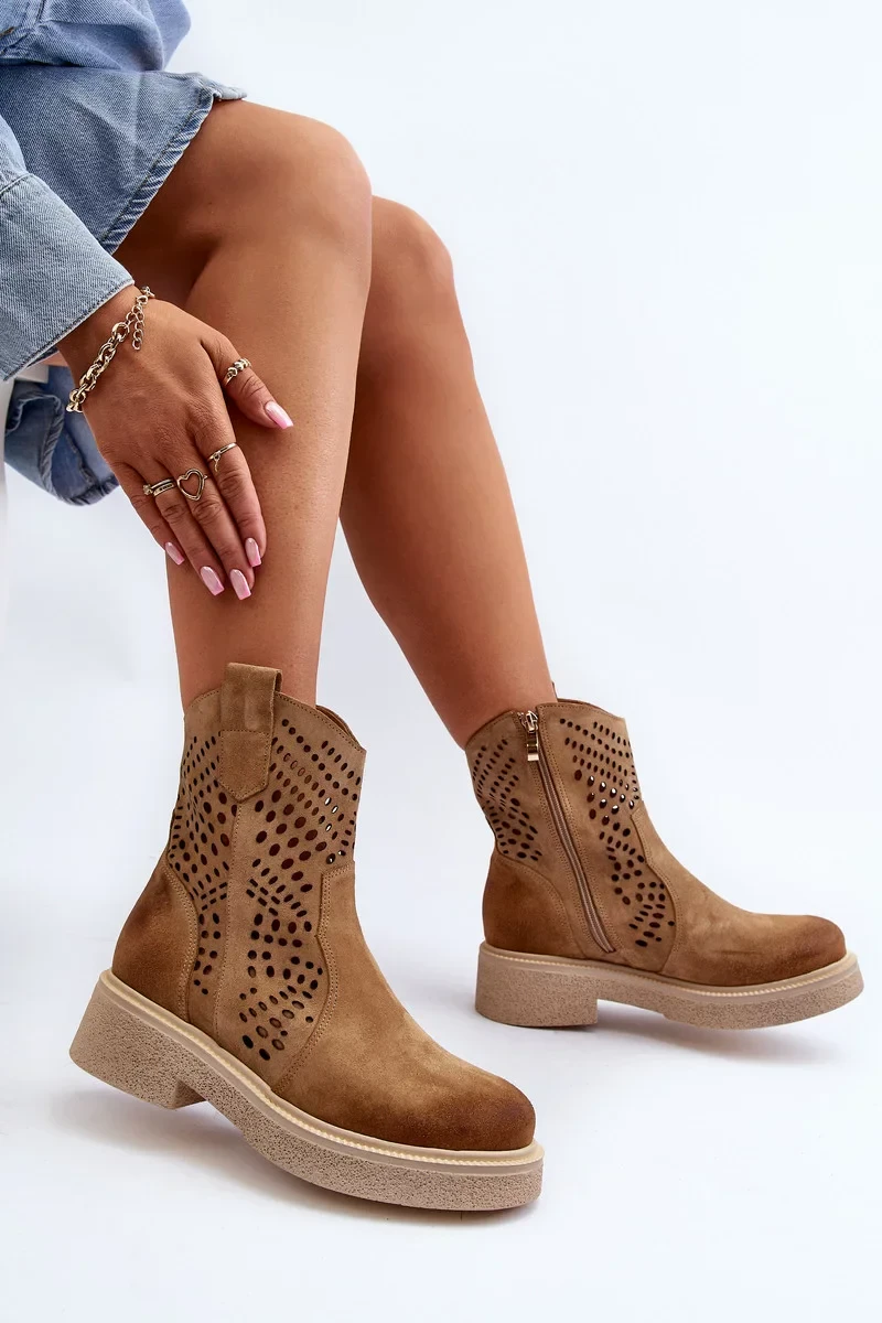 Zazoo Semišové dámské boty na plochém podpatku, prolamované, béžová