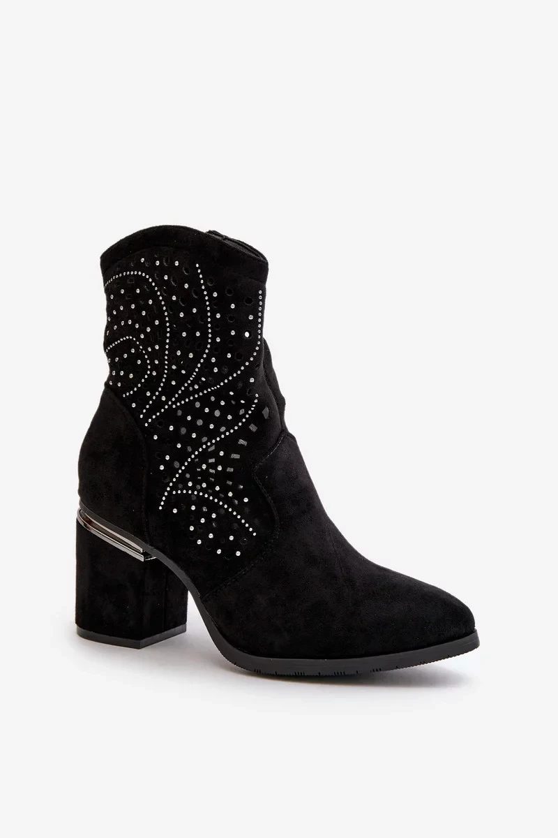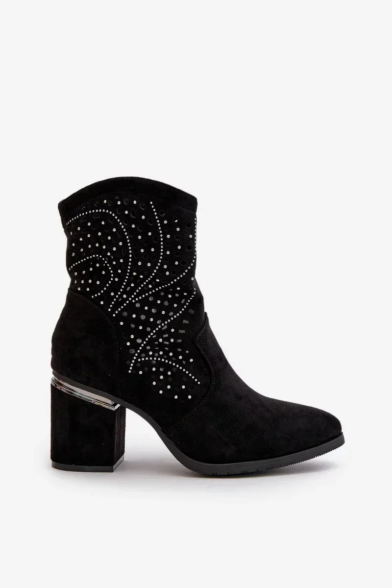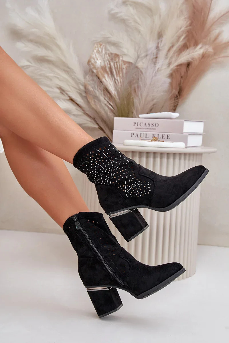 Zdobené Ažurové Kotníkové Boty Dámské Na Podpatku Z Eko Semiše Černé S.Barski
