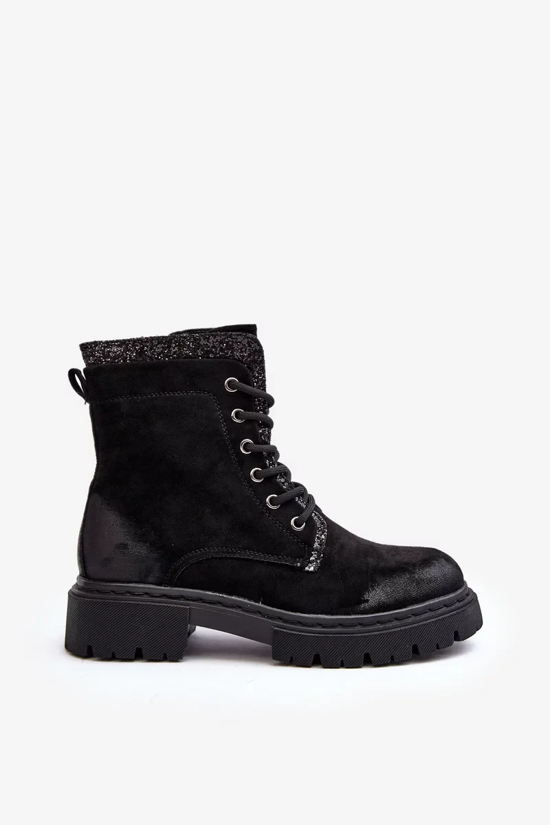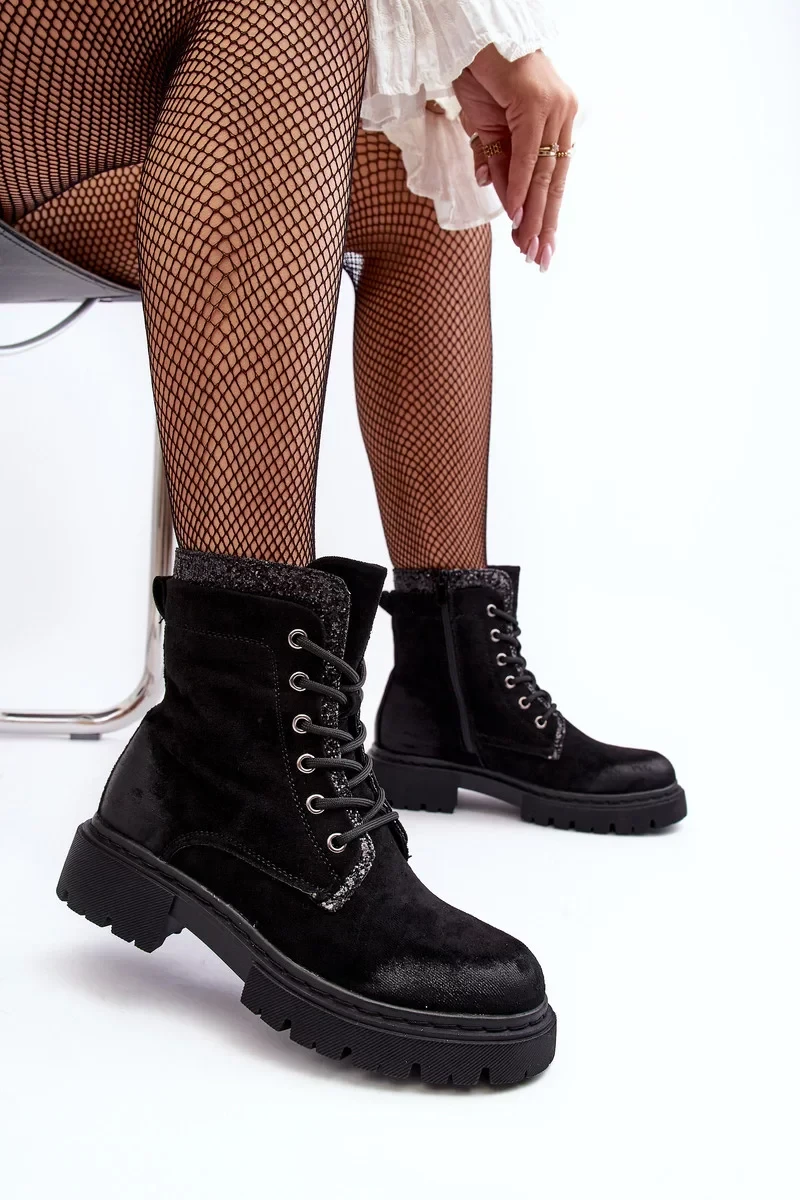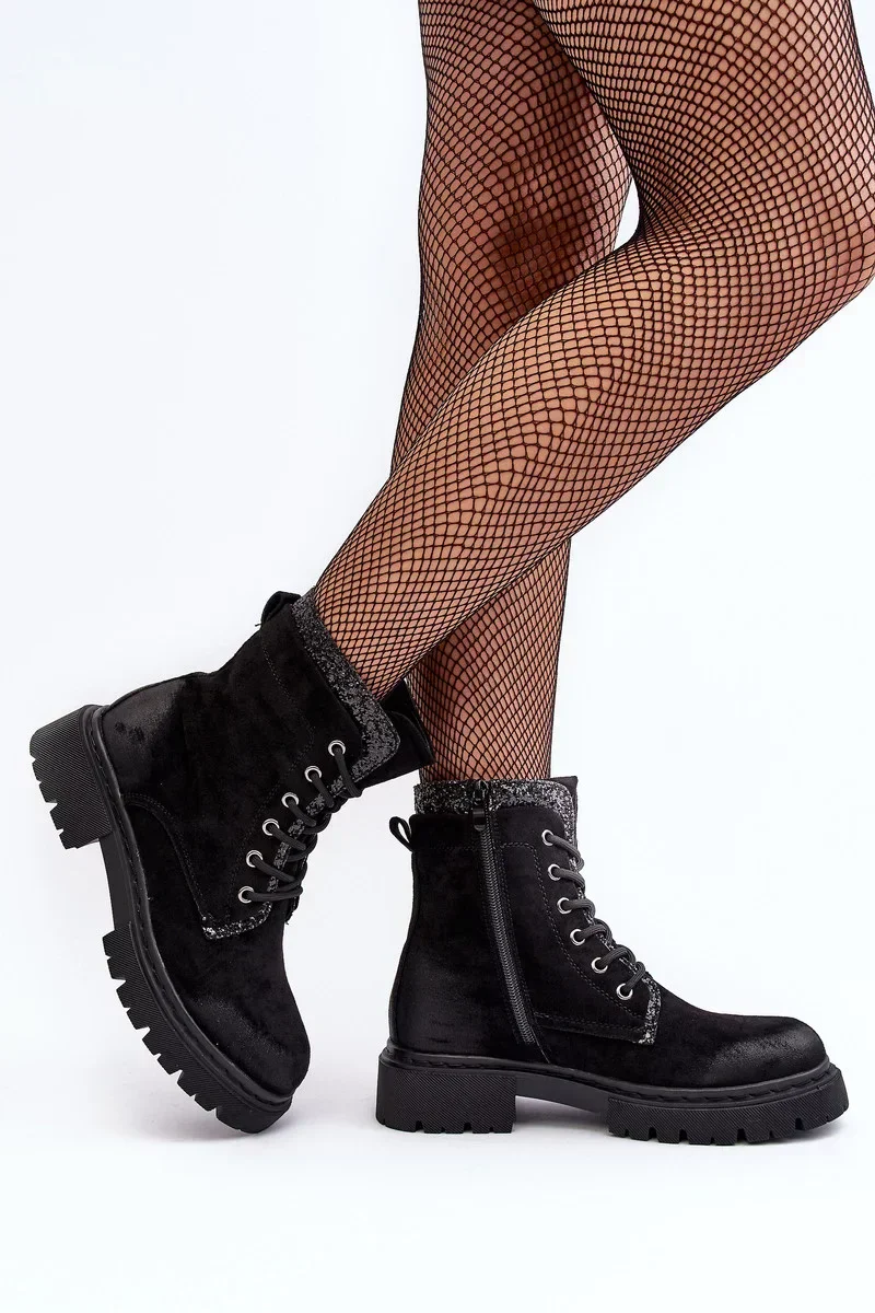 Dámské kotníkové boty zdobené drobnými lesklými flitry. Nasazené na platformě a plochém podpatku. Zapínání na zip. Šněrování vpředu. Zaoblené prsty. Vnitřek je zateplen dekou na boty. Klasický model, který doplní téměř každý podzimně-zimní styling! Při výběru velikosti se řiďte tabulkou velikostí.