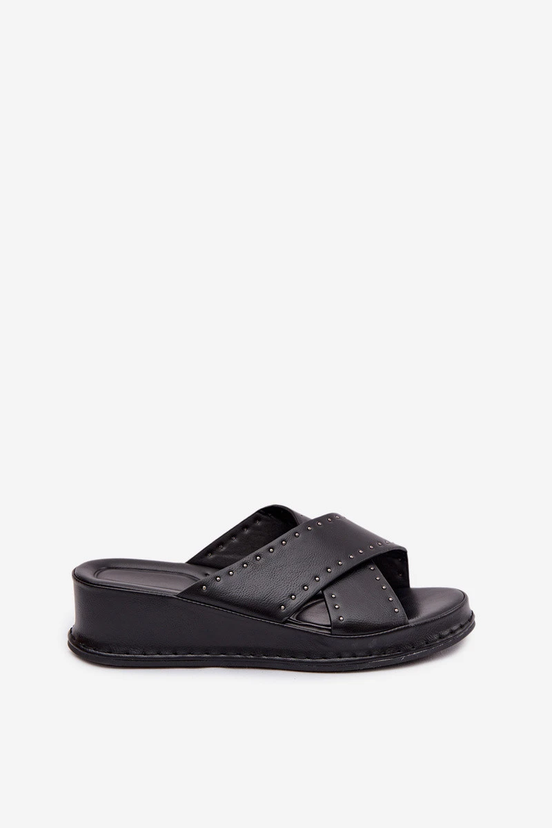 Dámské nazouváky z eko kůže jsou stylovým návrhem na letní dny. Model na pohodlném klínu zajišťuje komfort nošení a jemně zeštíhluje postavu. Vepředu jsou dva proplétané pásky ozdobené malými zlatými kuličkami, které dodávají celku jemný lesk a ženský charakter. Tyto nazouváky se skvěle hodí jak k běžným, tak k elegantnějším letním stylizacím. Při výběru velikosti se řiďte tabulkou velikostí.