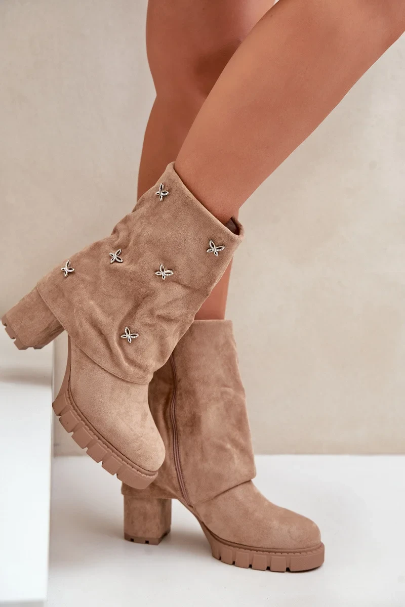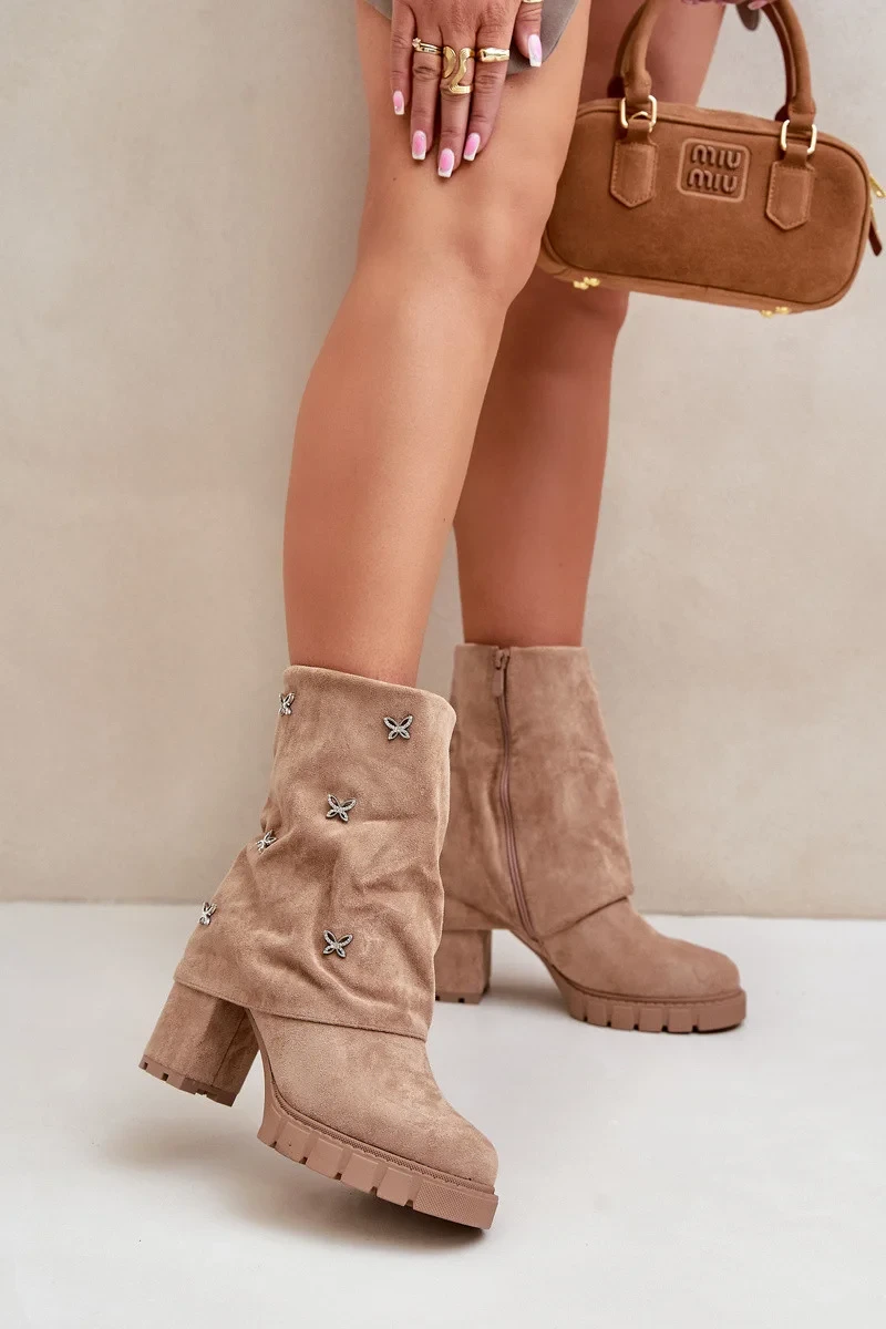 Zdobené Kotníkové Boty S Ohnutým Svrškem Na Podpatku Béžové Esadora