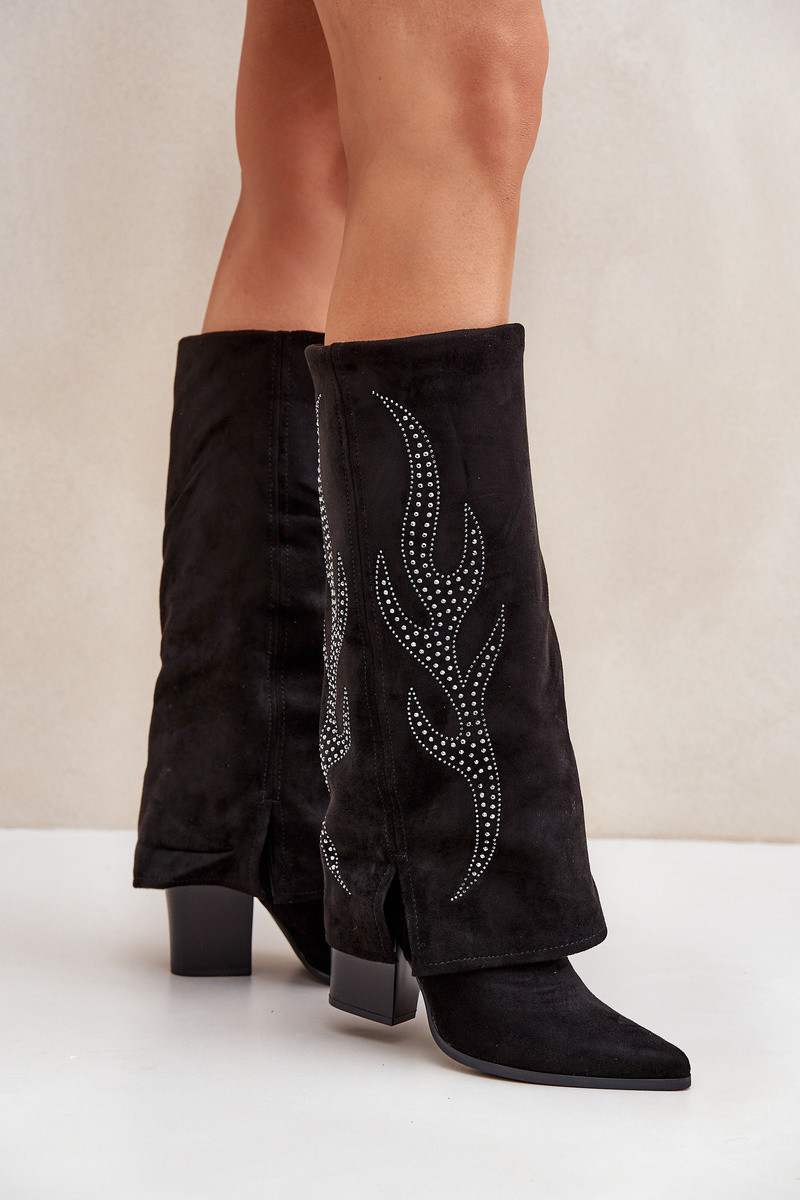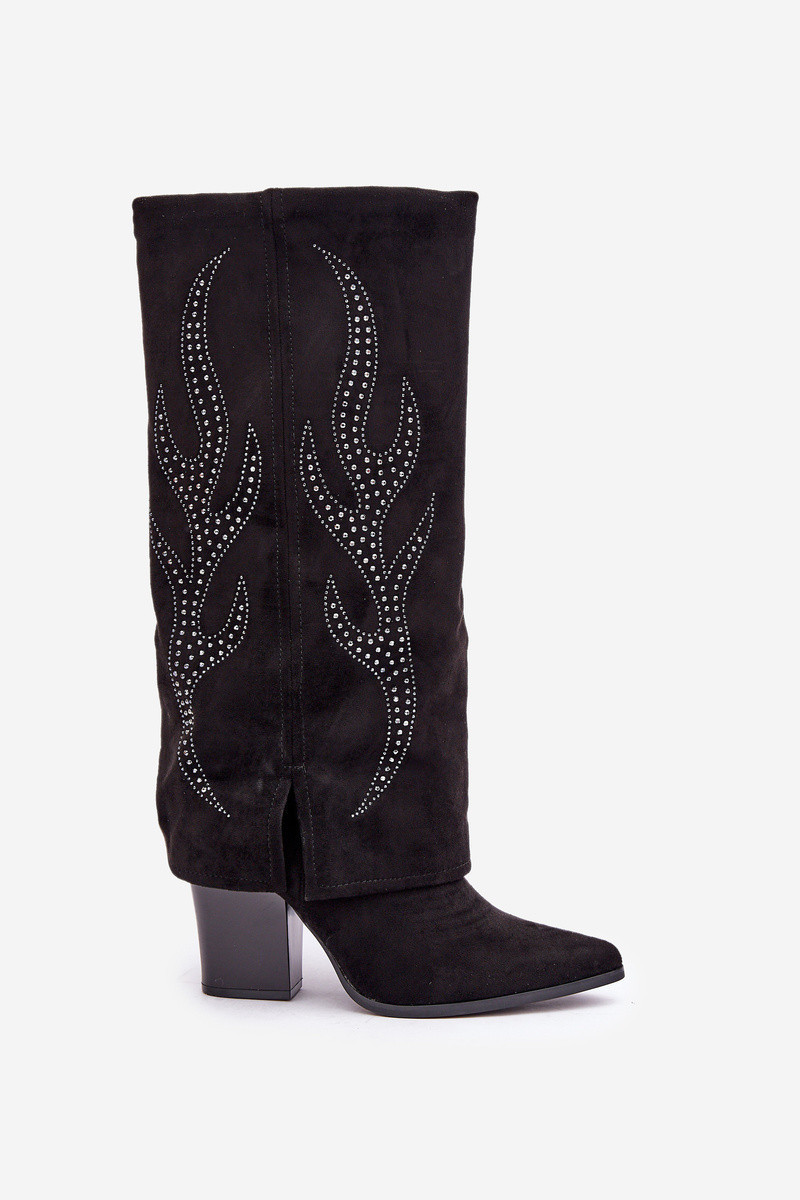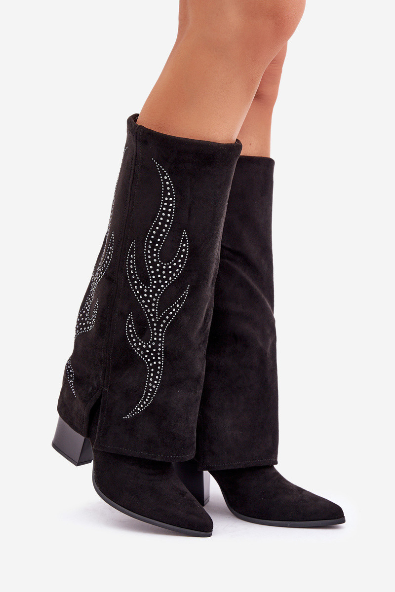 Zdobené kozačky s ohrnutým svrškem na podpatku černé Ivilta