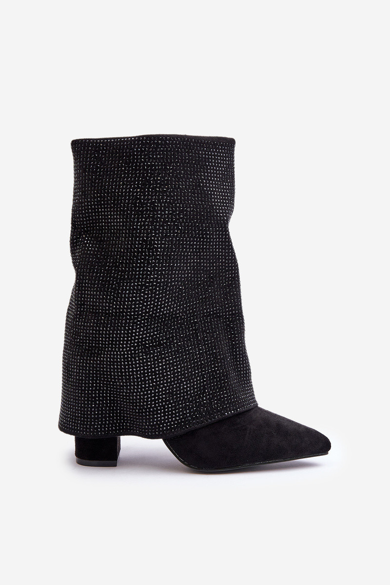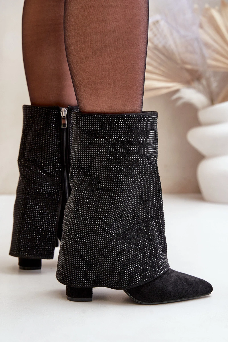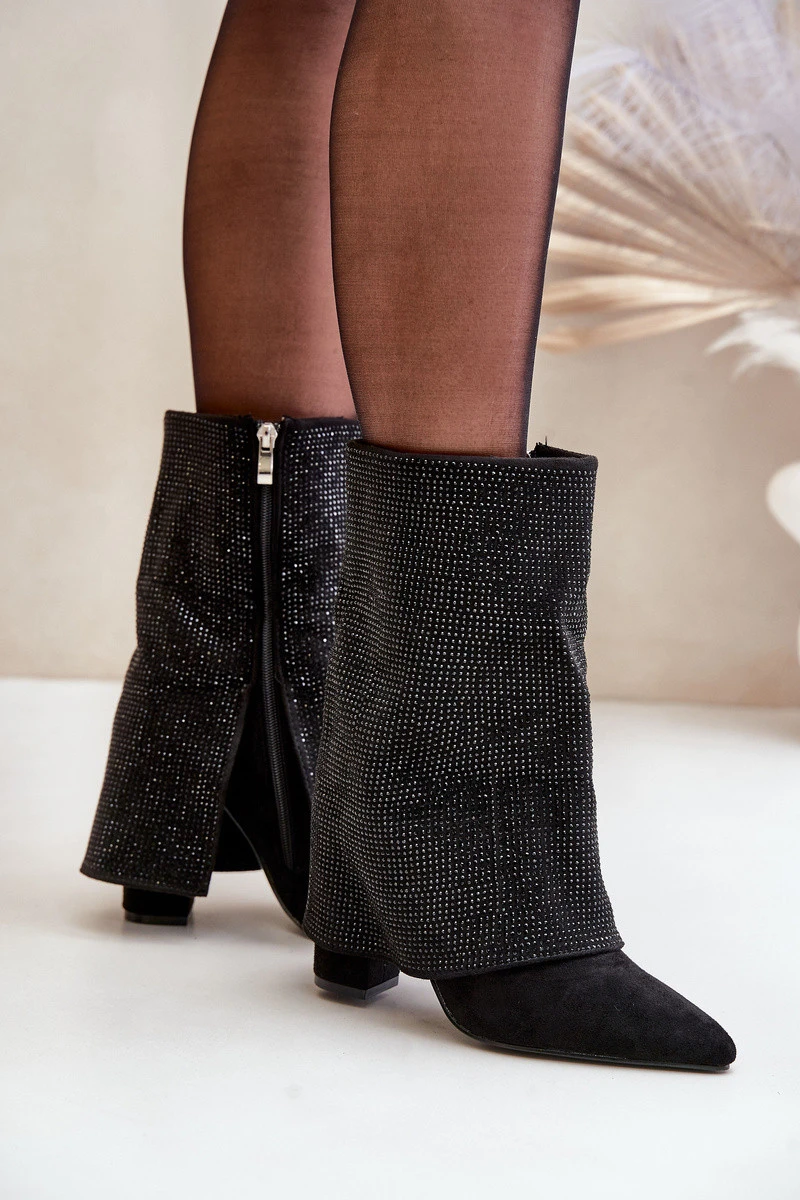 Elegantní boty s ohrnutým svrškem, zdobené třpytivými zirkony, které přitahují pozornost a dodávají lesk každému outfitu. Vyrobené z eko semiše, usazené na stabilním sloupkovém podpatku, zaručují pohodlné nošení. Model s špičatými prsty, zateplený a se zipem, zajišťuje teplo v chladnějších dnech. Ideální na speciální příležitosti nebo jako stylový doplněk k podzimním a zimním outfitům, přinášející výjimečný akcent glamour. Při výběru velikosti se řiďte tabulkou velikostí.