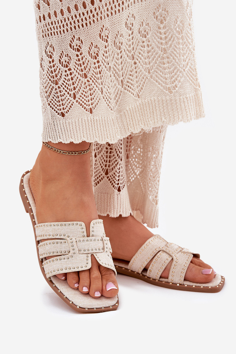 Zdobené pantofle na plochém podpatku béžové model 21699494 - Boto