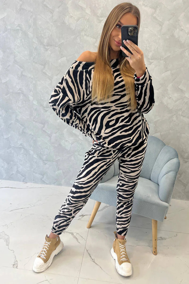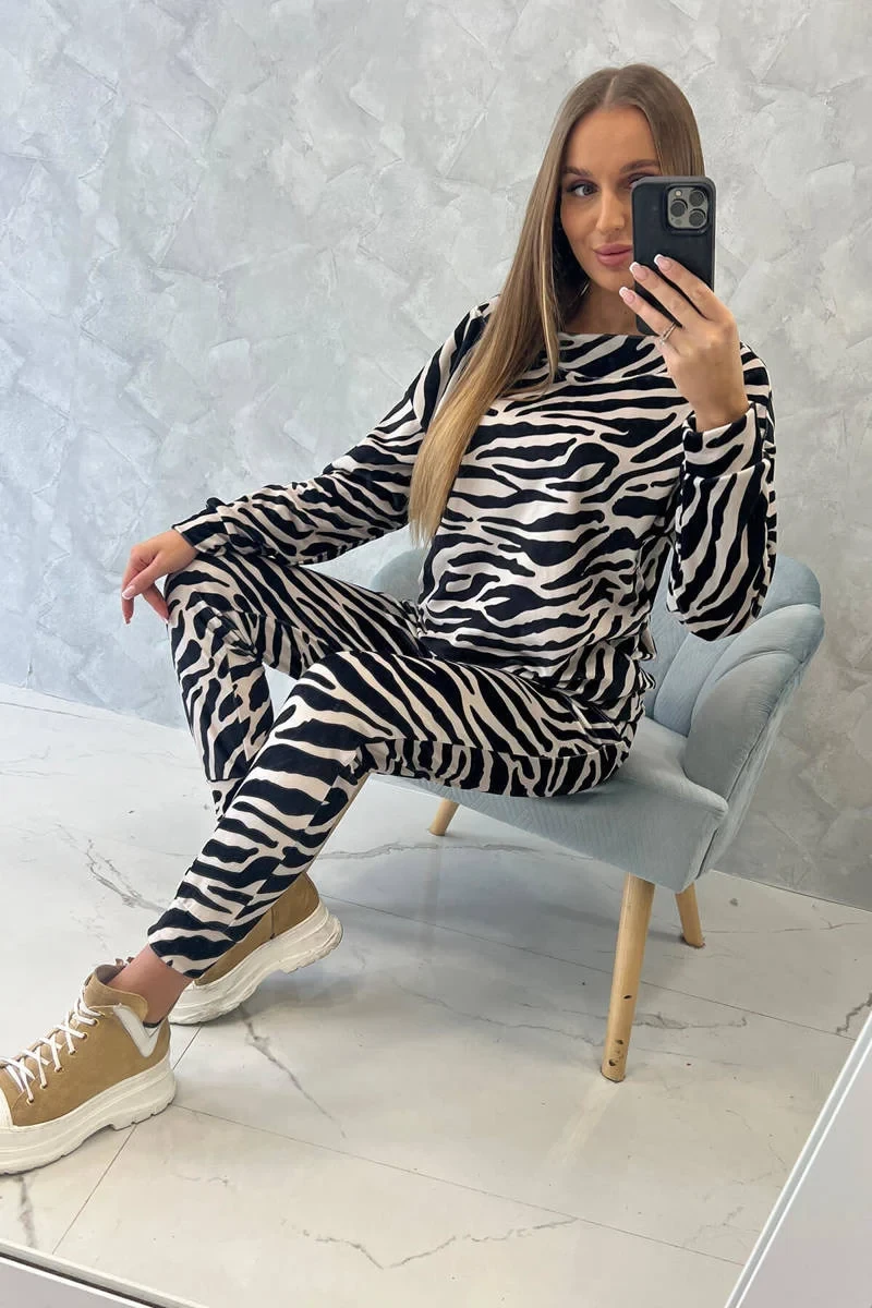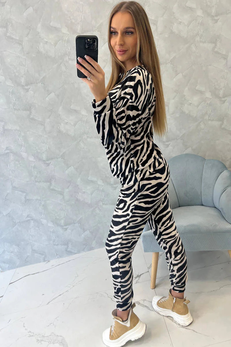 Představujeme vám sadu mikiny a kalhot. Sada z veluru. Mikina a kalhoty s motivem zebry. Kalhoty s kapsami a zavazováním v pase. Velmi módní a stylová sada. Sada je vyrobena z vysoce kvalitního materiálu. Velikost je univerzální a vyhovuje dámám velikosti S, M nebo L.