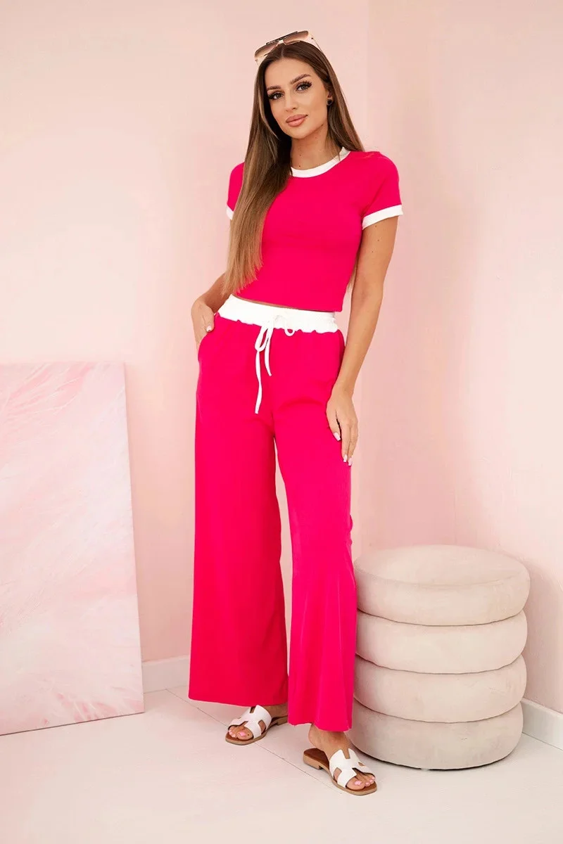 Žebrovaný komplet halenka + kalhoty se širokou nohavicí fuchsie