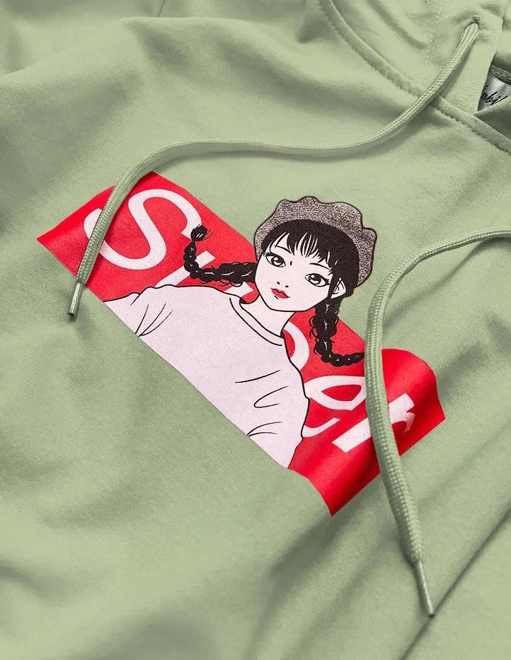 Mikina má volný střih, délku k bokům a obléká se přes hlavu. Rukávy a spodní okraj modelu jsou olemované stahovacími lemy. Model má jednu "klokaní" kapsu.