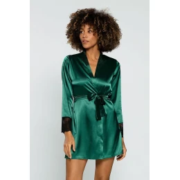 Smaragdové negližé z nádherně měkkého saténu s rafinovaným leskem. Hladké, zavázané v pase, vždy sexy. Dlouhé rukávy zdobené krajkou. Výrobek je zabalen v krabičce a je ideální i jako dárek. Složení: 100% polyester.