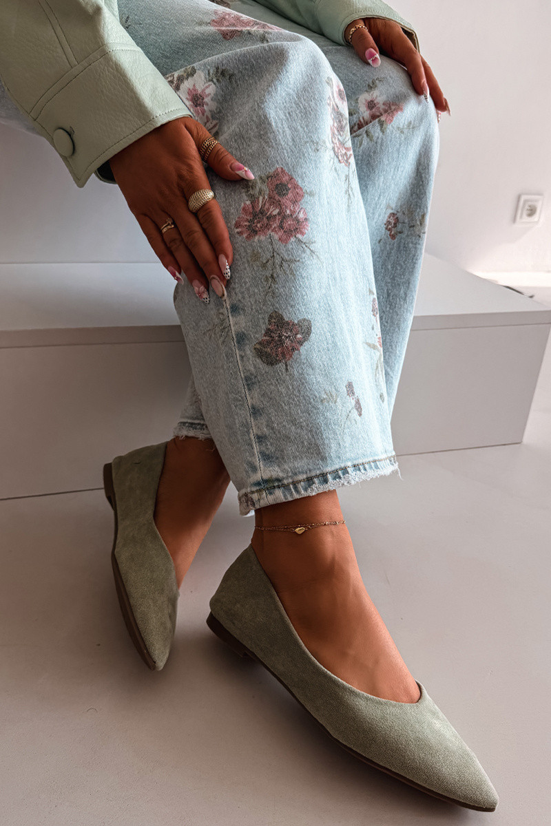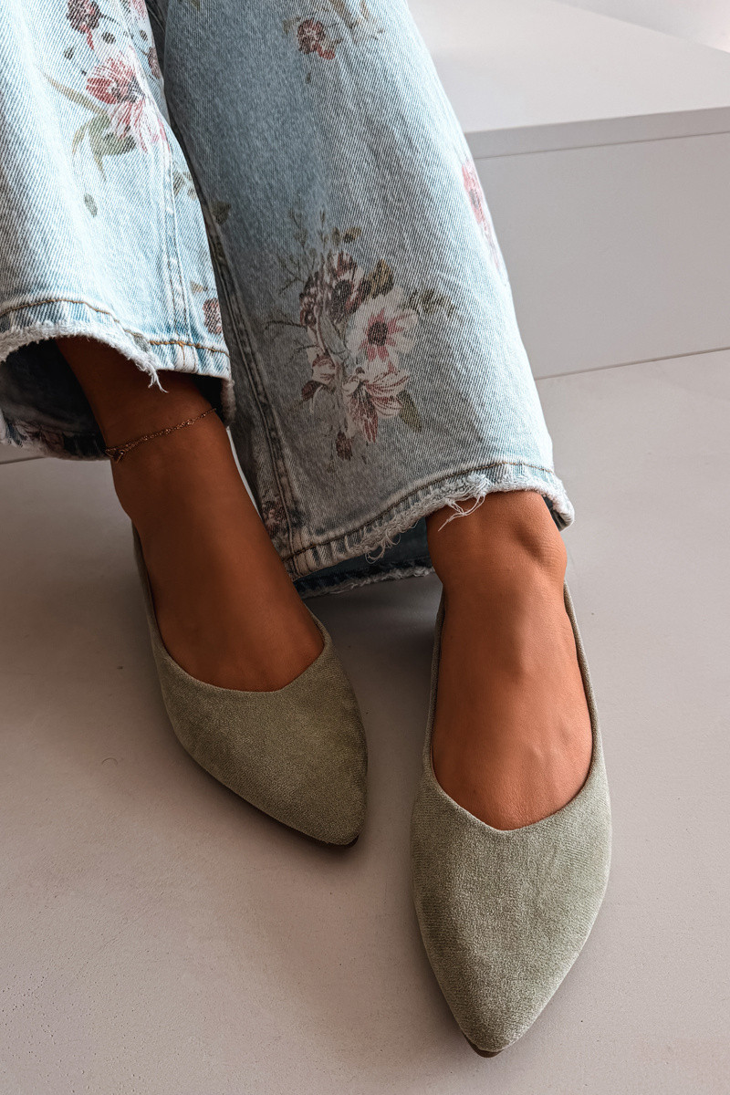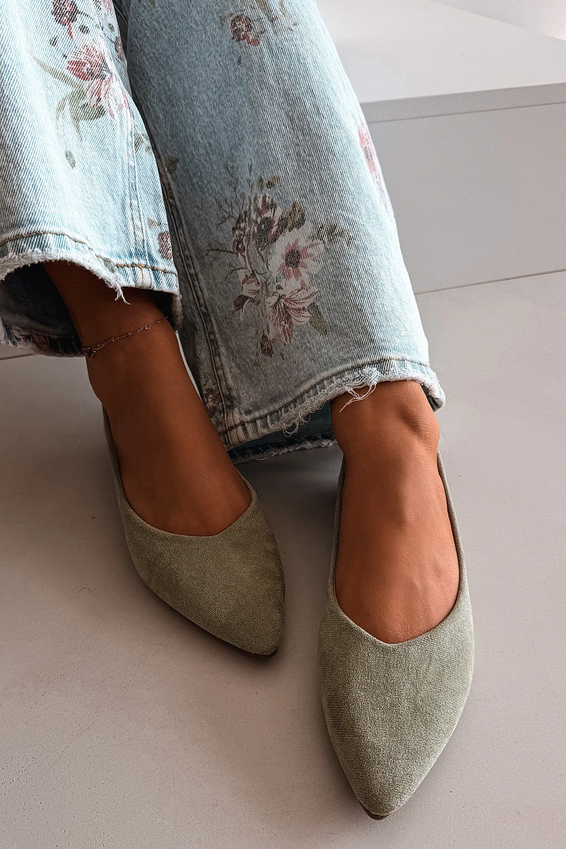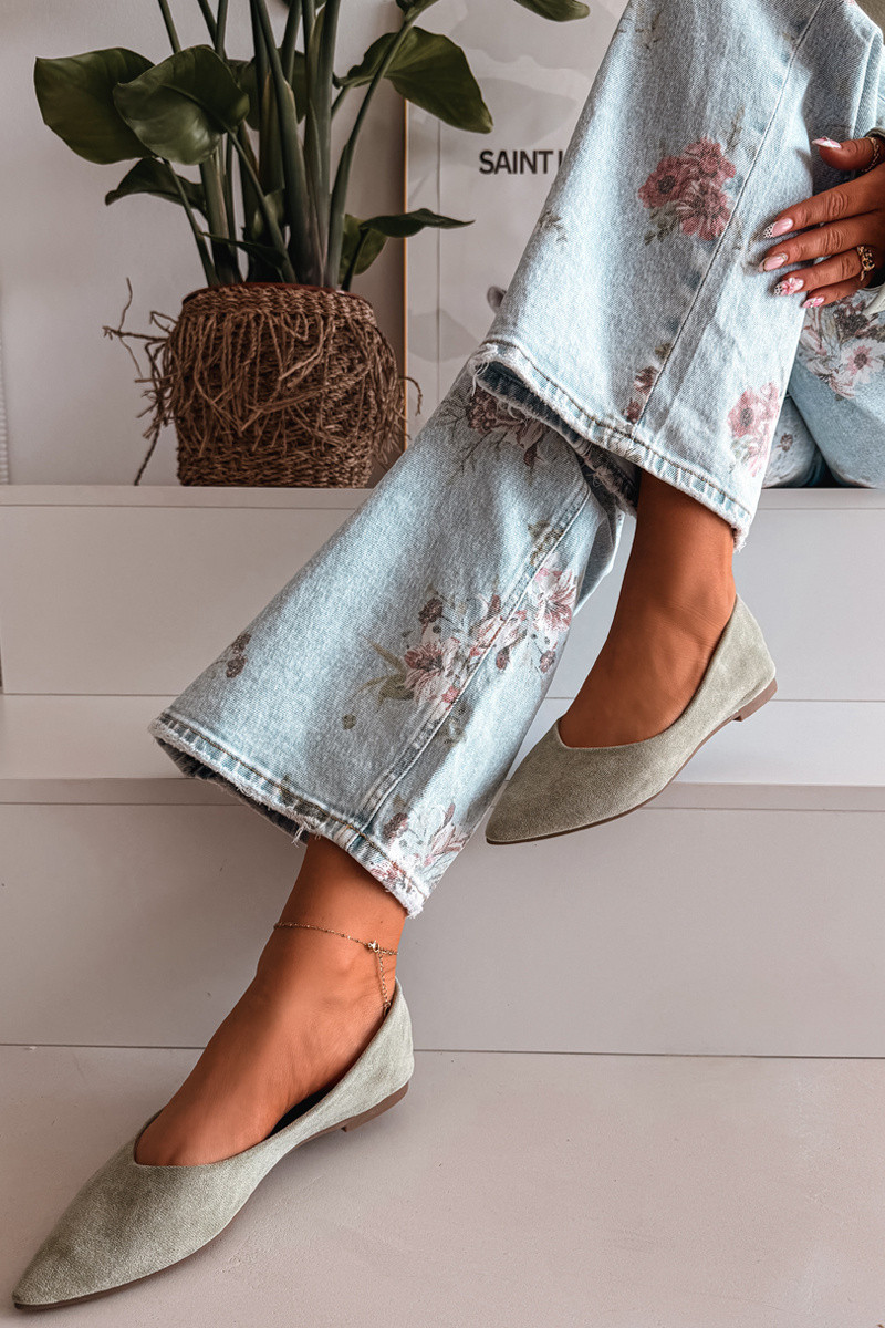 Dámské baleríny z eko semiše jsou stylovou a pohodlnou volbou na každý den. Plochá podrážka zajišťuje pohodlí při nošení, díky čemuž je model ideální na dlouhodobé používání. Špičaté nosy opticky zeštíhlují nohu a dodávají celkovému vzhledu elegantní charakter. Měkká vložka zvyšuje komfort, přizpůsobuje se noze a poskytuje pohodlí po celý den. Ideální volba pro ženy, které ocení spojení klasiky, pohodlí a jemné elegance. Při výběru velikosti se řiďte tabulkou velikostí.