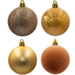 Wybierz zestaw 16 złotych bombek w czterech różnych wykończeniach! Dzięki zróżnicowanym fakturom Twoja choinka nabierze wyjątkowej głębi i świątecznego luksusu, a wnętrze zyska ciepły, przytulny klimat.