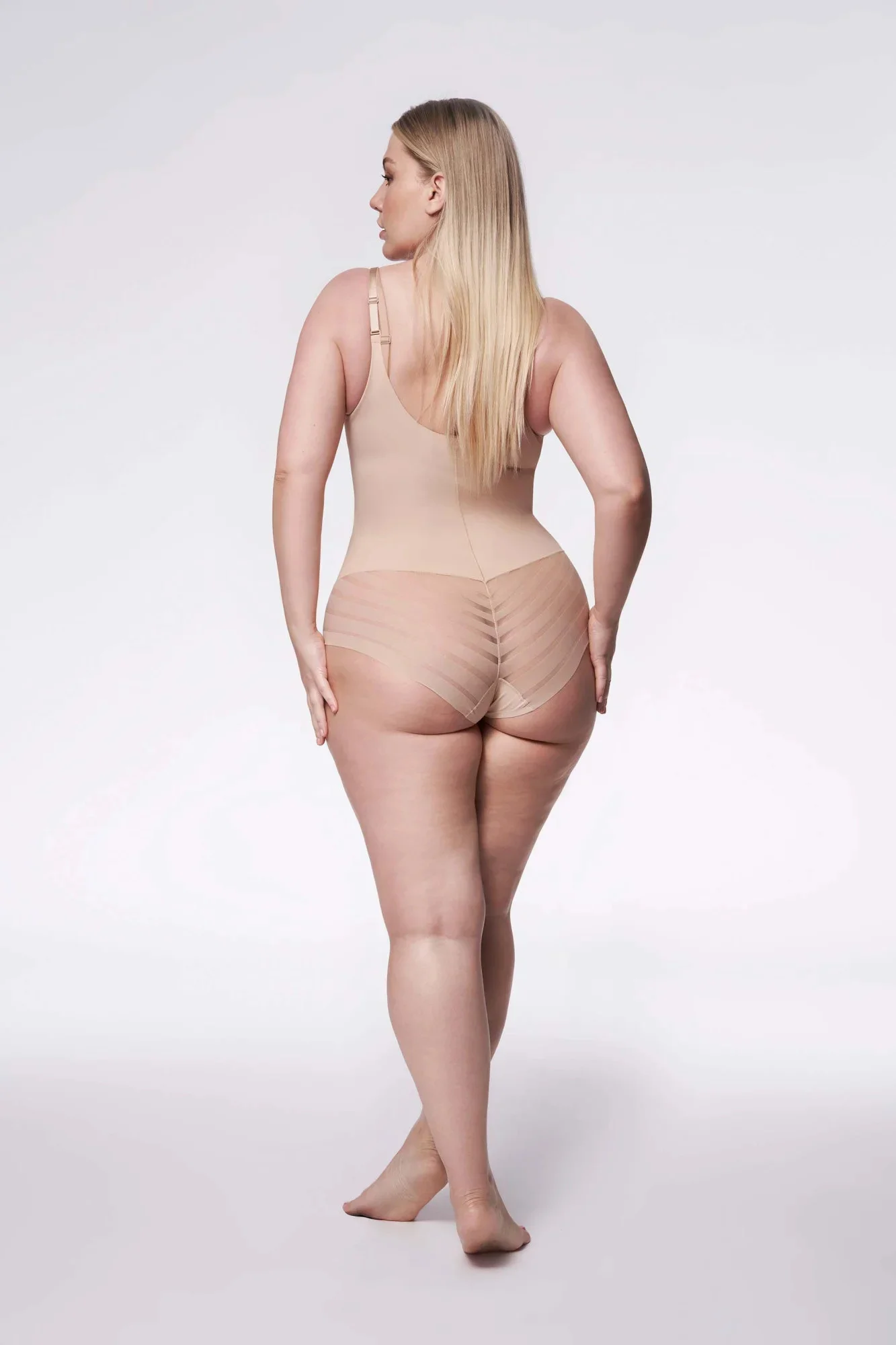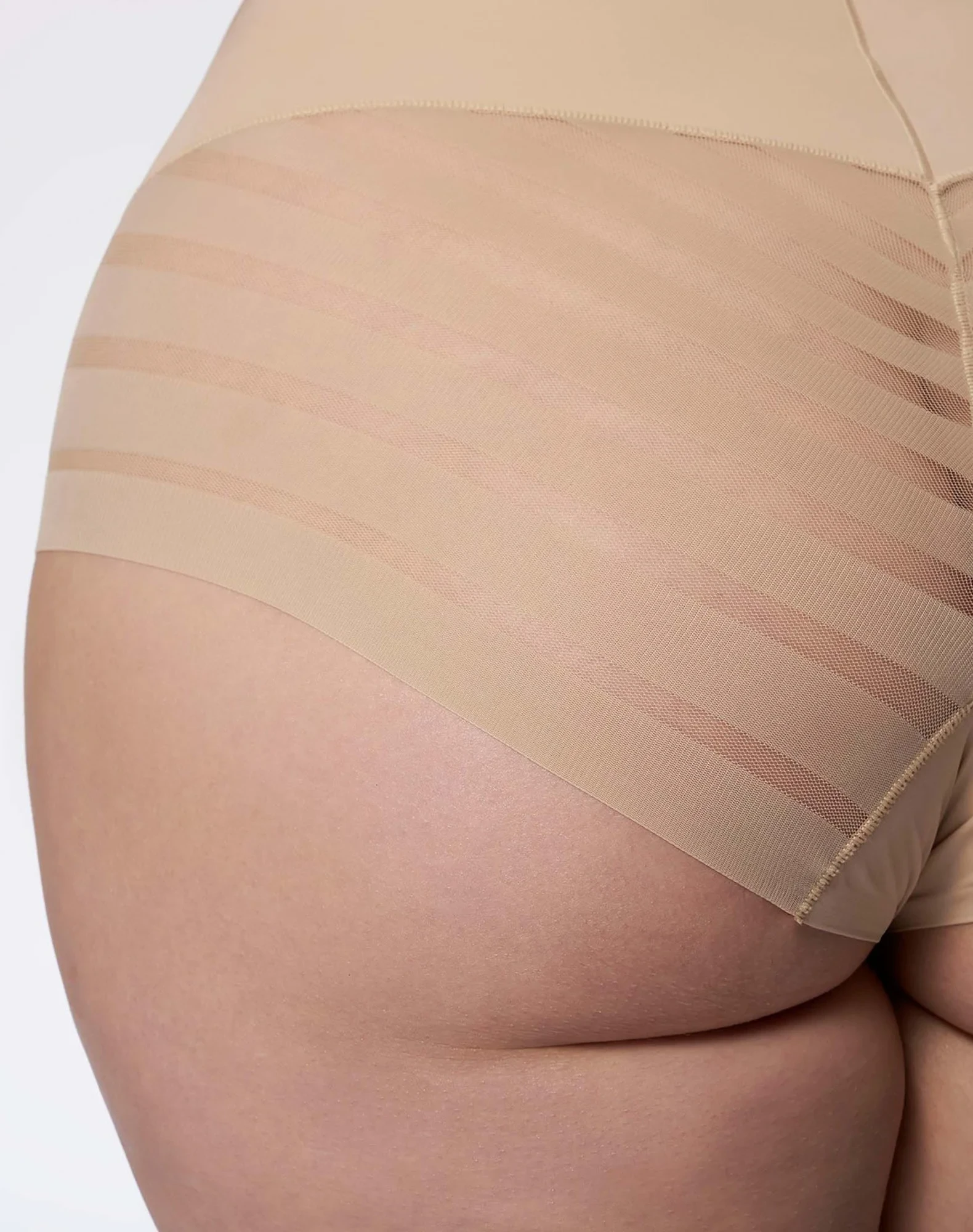 Senzační výrobek - zeštíhlující body pod prsa model 119, vyrobené technologií Invisible Line, prakticky neviditelné pod oblečením. S plochými zakončenými okraji, elastické. Modeluje břicho, pas a hýždě. Je nenahraditelné, pokud jde o zlepšení tvaru postavy. Kvalitní úplet umožňuje odvod vlhkosti a poskytuje vysoký komfort nošení. Na hýždích sexy síťované vsadky. Polský výrobce. Vysoká kvalita. Složení: 84 % polyamid, 16 % elastan. V rozkroku bavlněná vsadka (100 % bavlna).