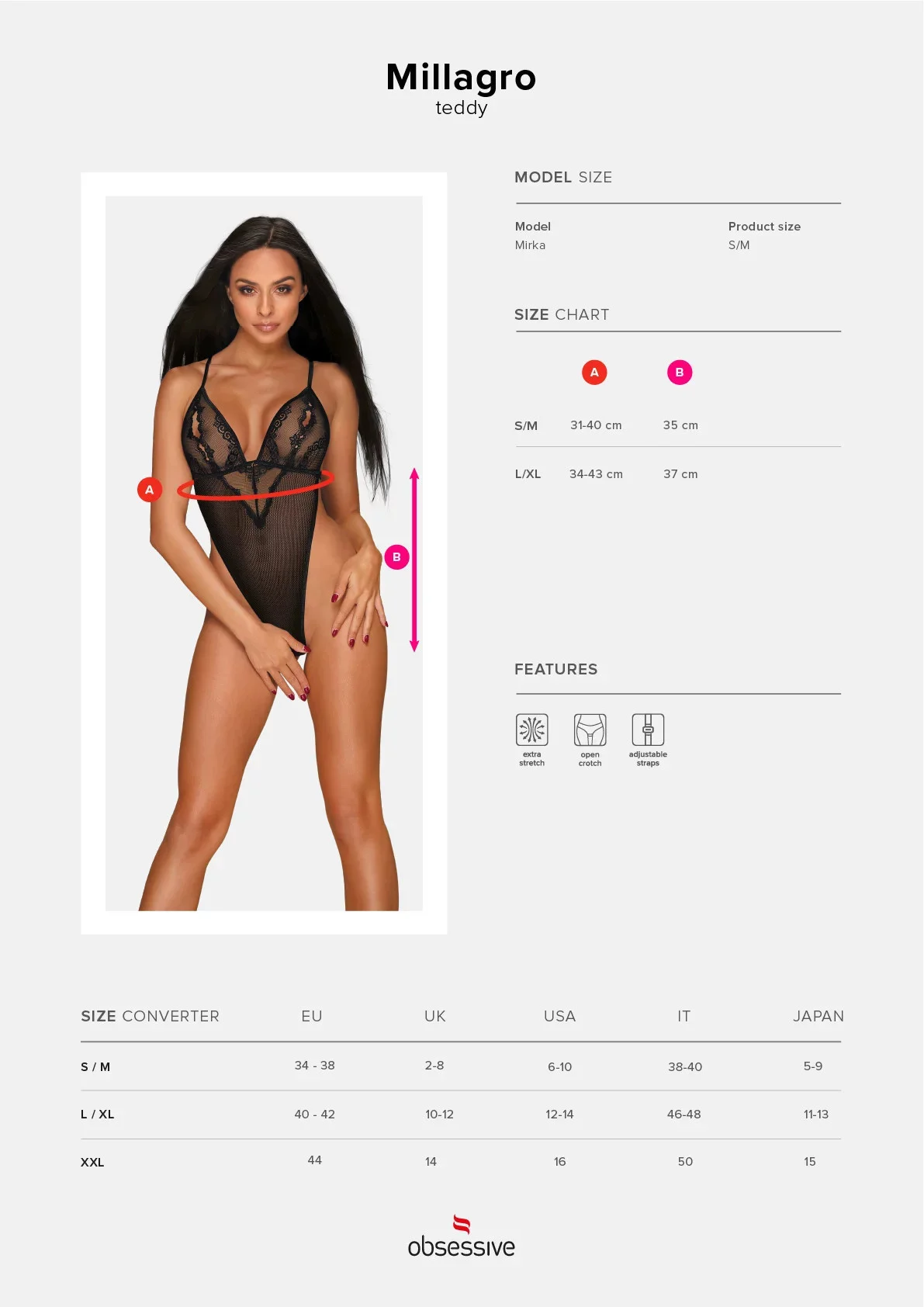 Produkt Žhavé body Millagro teddy - Obsessive prodáváme v těchto velikostech: L/XLa barvách černá5901688231517
