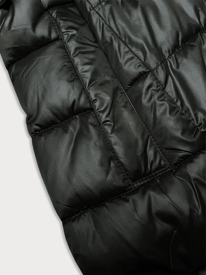 Bunda je zateplená syntetickou péřovou výplní, má dvě kapsy a zapíná se zipem. Navíc je uvnitř bundy na zádech kožešina. Kapuci lemuje kožešina, kterou je možné odepnout. Na koncích rukávů jsou skryté stahovací lemy. Bunda má délku pod boky.
