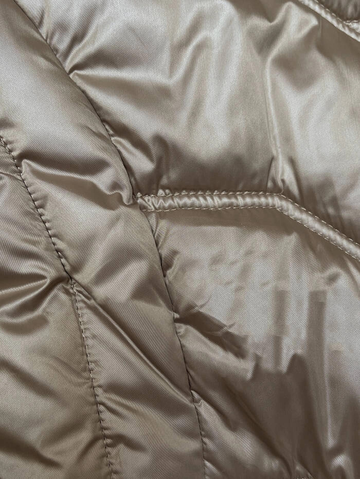 Bunda je vypasovaná, je zateplená syntetickou péřovou výplní, má dvě kapsy a zapíná se dvoustranným zipem. Kapuci lemuje kožešina, kterou je možné odepnout. Na koncích rukávů jsou skryté stahovací lemy. Bunda má délku do poloviny stehen.