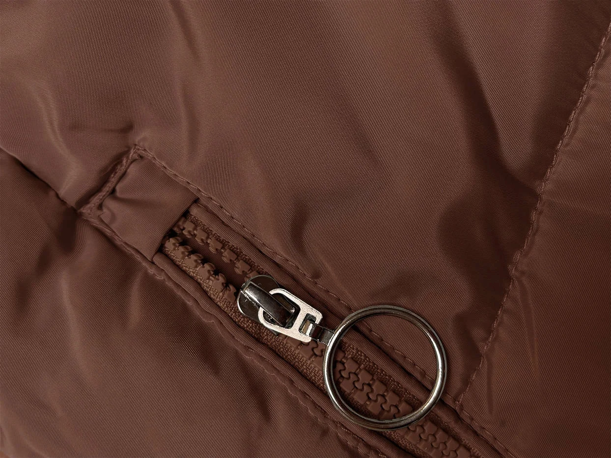 Bunda je lehce vypasovaná, je zateplená syntetickou péřovou výplní, má kožešinovou podšívku, dvě kapsy a zapíná se zipem. Model má kapuci, kterou není možné odepnout. Na koncích rukávů jsou skryté stahovací lemy. Bunda má délku pod boky.