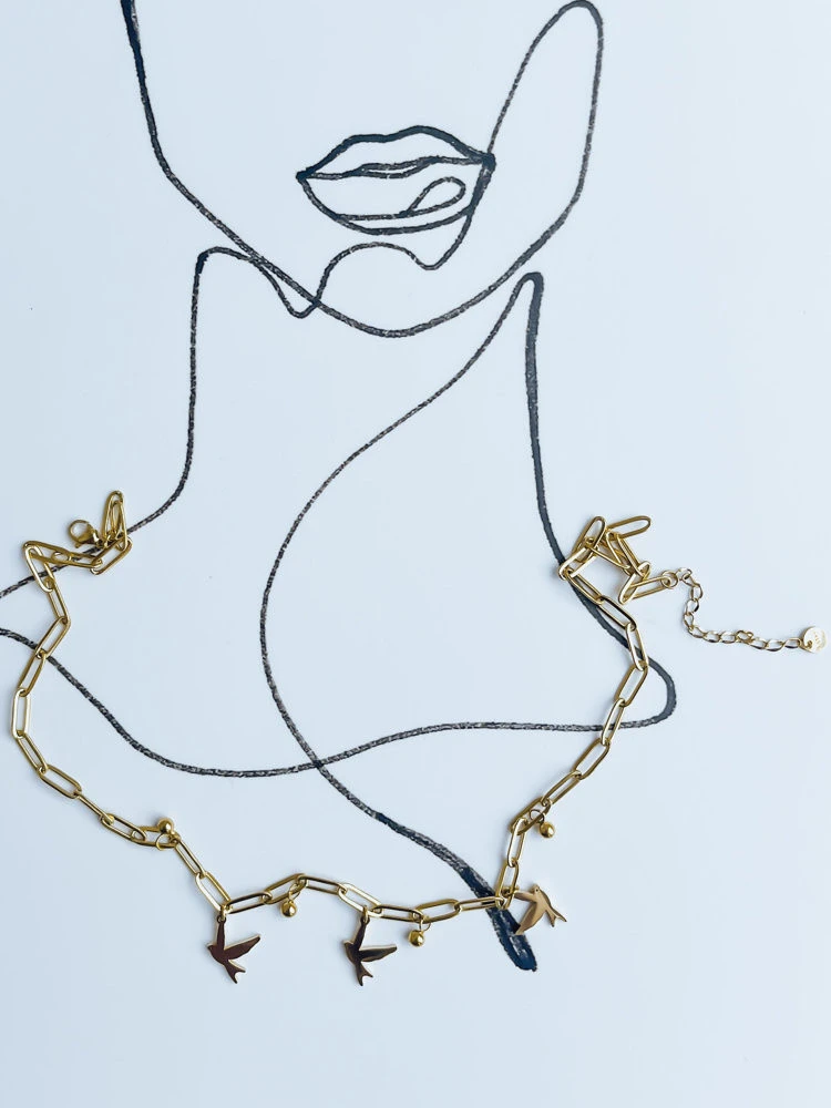 Výrazný náhrdelník zlaté barvy z řetízku z velkých ok, zdobený přívěsky ve tvaru vlaštovek, ideální jako dárek, se zapínáním s nastavitelnou délkou.