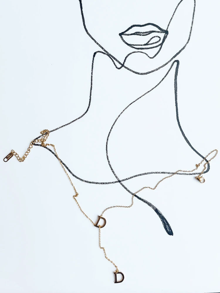 Výrazný náhrdelník zlaté barvy, který krásně doplní styly s hlubokými výstřihy. Na tenkém řetízku jsou umístěna dvě písmena "D", z nichž jedno je zakončeno řetízkem, který prochází dalším písmenem. Má zapínání s nastavitelnou délkou.
