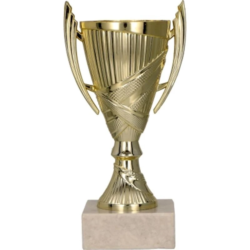 Klasyczny, złoty puchar wykonany z wysokogatunkowego, trwałego plastiku. Elegancki kielich typu conical z wygodnymi uszami. Świetnie sprawdzi się jako puchar dla zwycięzców na różnego rodzaju turniejach i konkursach.