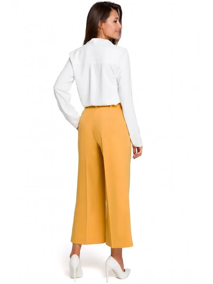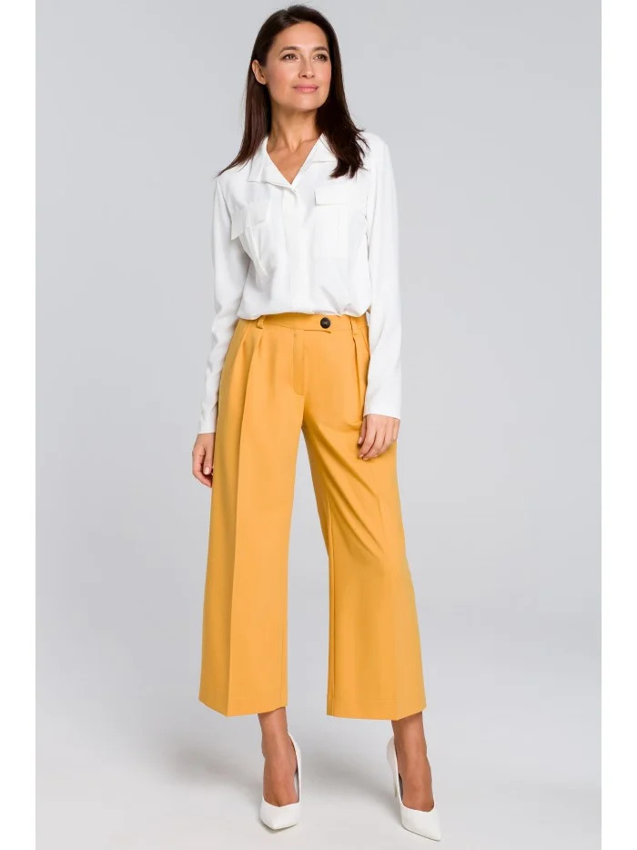 - 65 % polyester - 30 % viskóza - 5 % elastan Udělejte dojem s našimi plisovanými kalhotami s širokými nohavicemi. Kombinujte je s klasickými podpatky, abyste si mohli bez námahy vyrazit do společnosti, nebo s bílými teniskami a tričkem, abyste se stylizovali i mimo pracovní dobu. PODROBNOSTI O VÝROBKU: tkaný materiál široká řasená nohavice 7/8 délka předního dílu, boční kapsy bez podšívky dva knoflíky a zapínání na zip v přední části poutka na pásek naše modelka je vysoká 166 cm a nosí velikost S