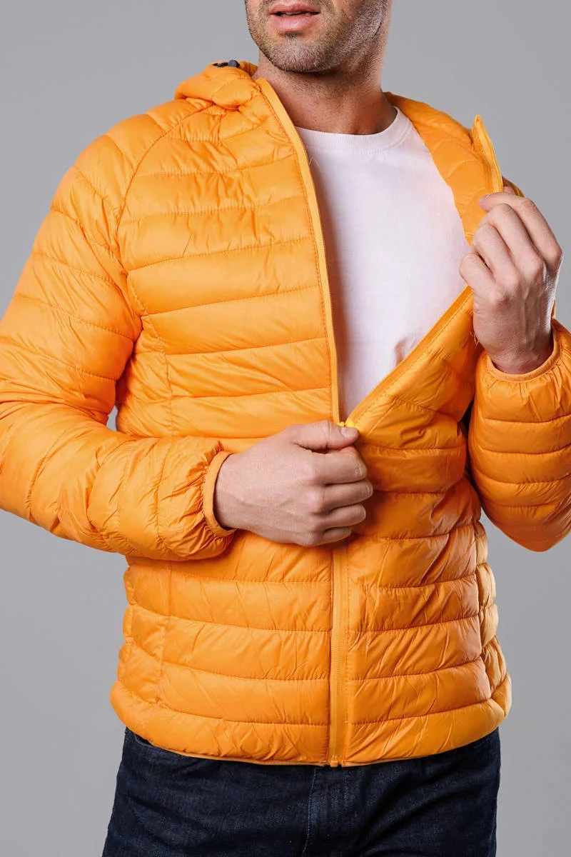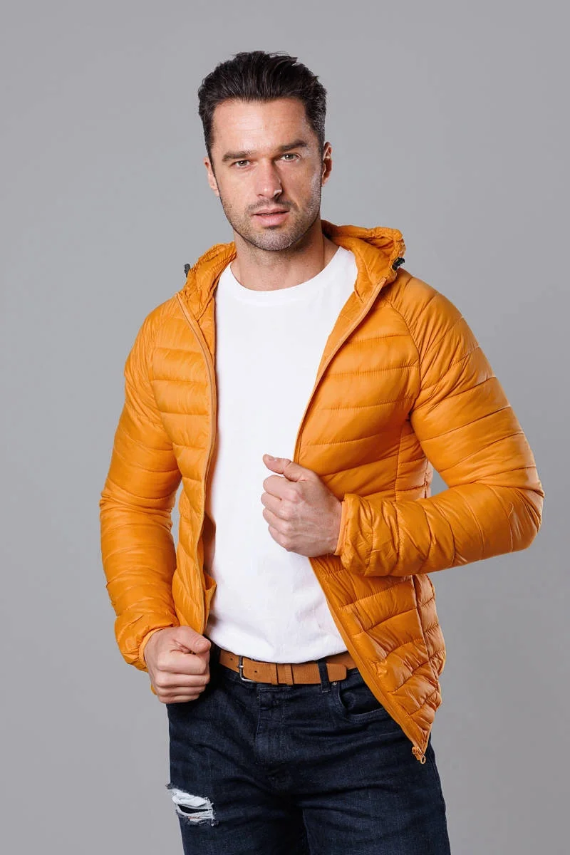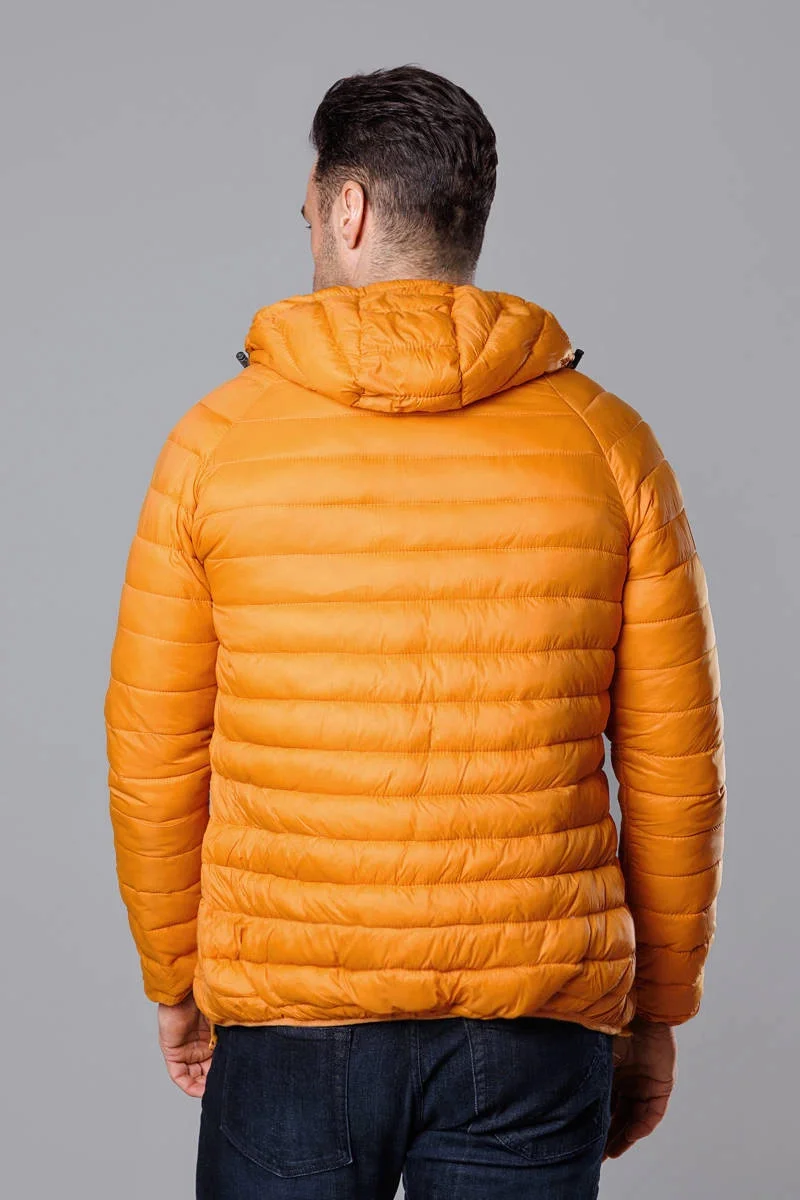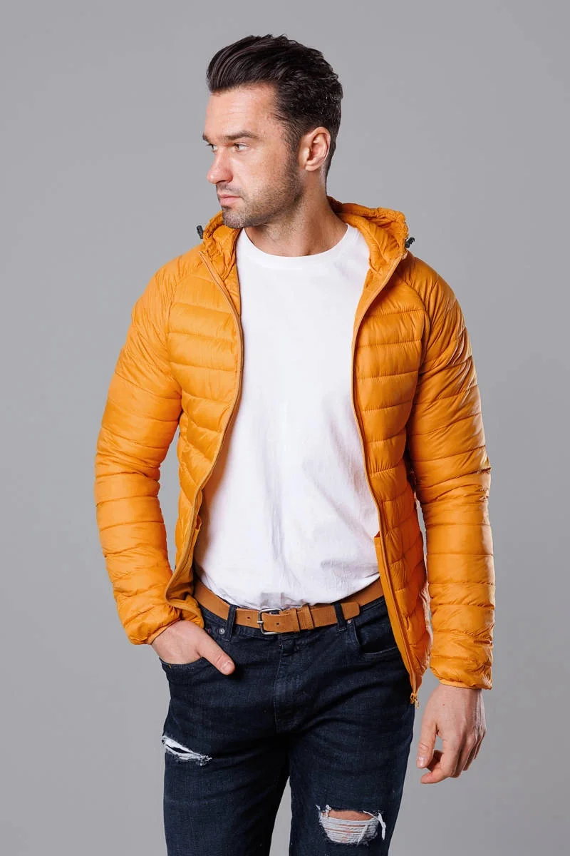 Žlutá pánská prošívaná bunda s kapucí (HM112-62)