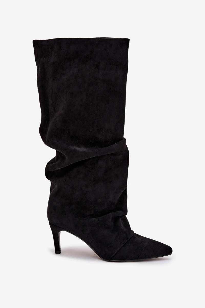 Zmačkané kozačky na jehlovém podpatku z ekzem veluru vyhřívané černé Mavella