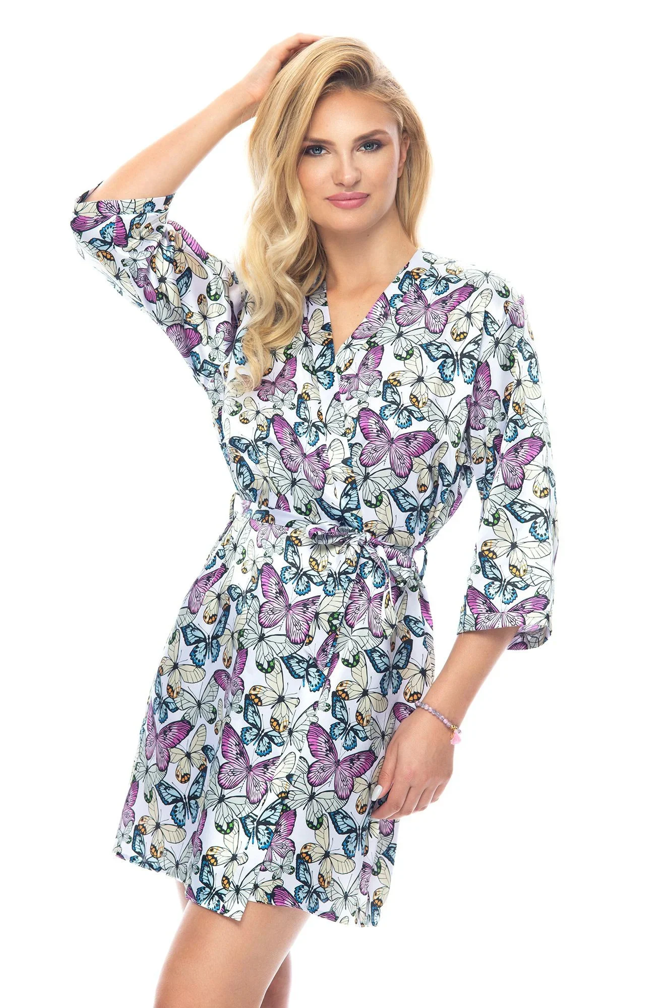 Krásný župan s motýlem z potištěného světlého saténu, jarní edice Irall. Zavazování v pase, rukávy po oblast loktů. Župan skvěle doplní soupravu a noční košili z řady Dilara. 100% polyester.