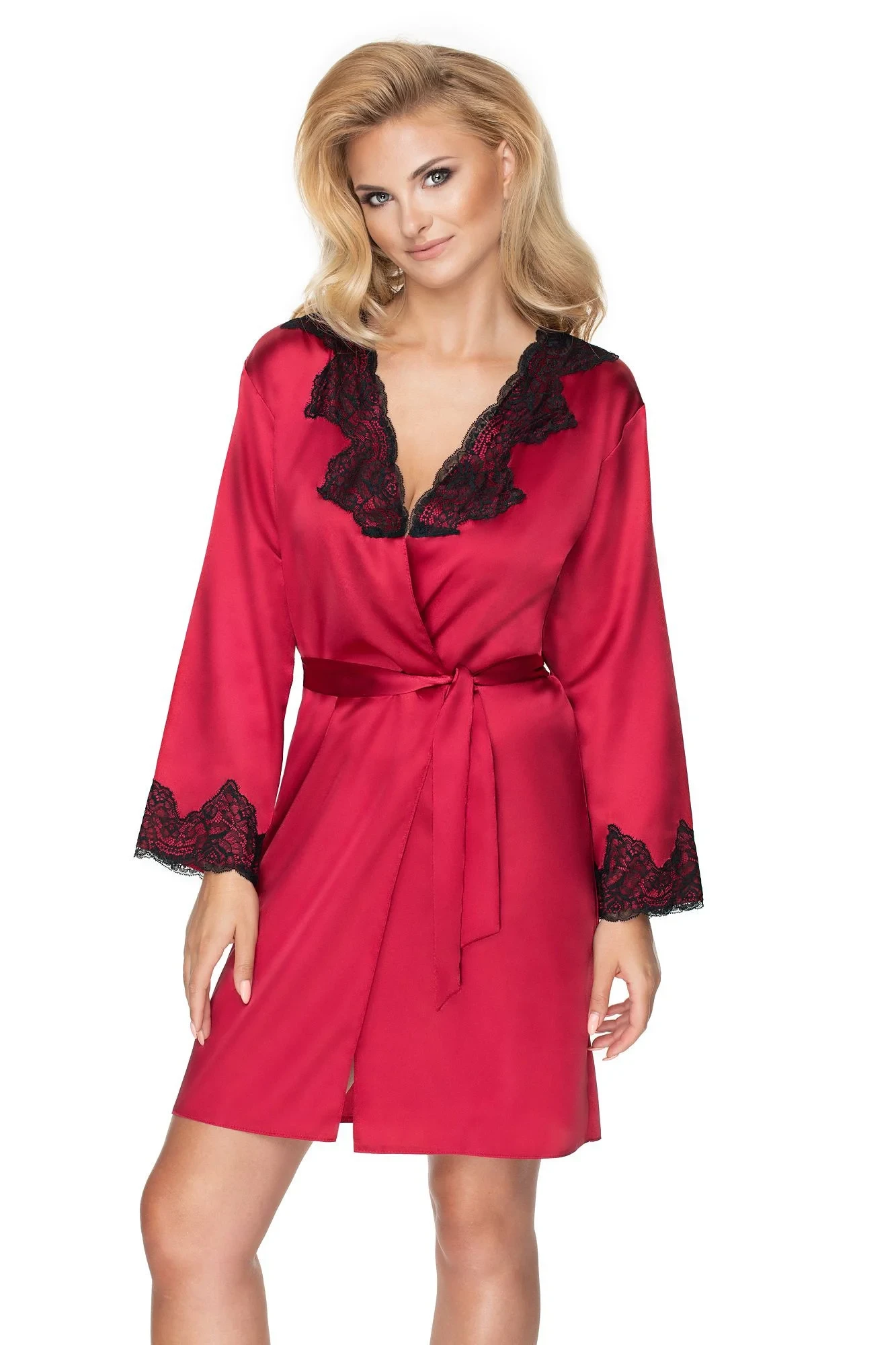 Úchvatný župan ve vínové (slavnostní) barvě, s černými ažurovými krajkovými vsadkami. Krásný a ženský! Krajka zvýrazňuje výstřih a zdobí rukávy u zápěstí. Jedná se o jedinečný, luxusní design, dokonalý, ženský střih, špičková kvalita. 97% polyester, 3% polyamid.