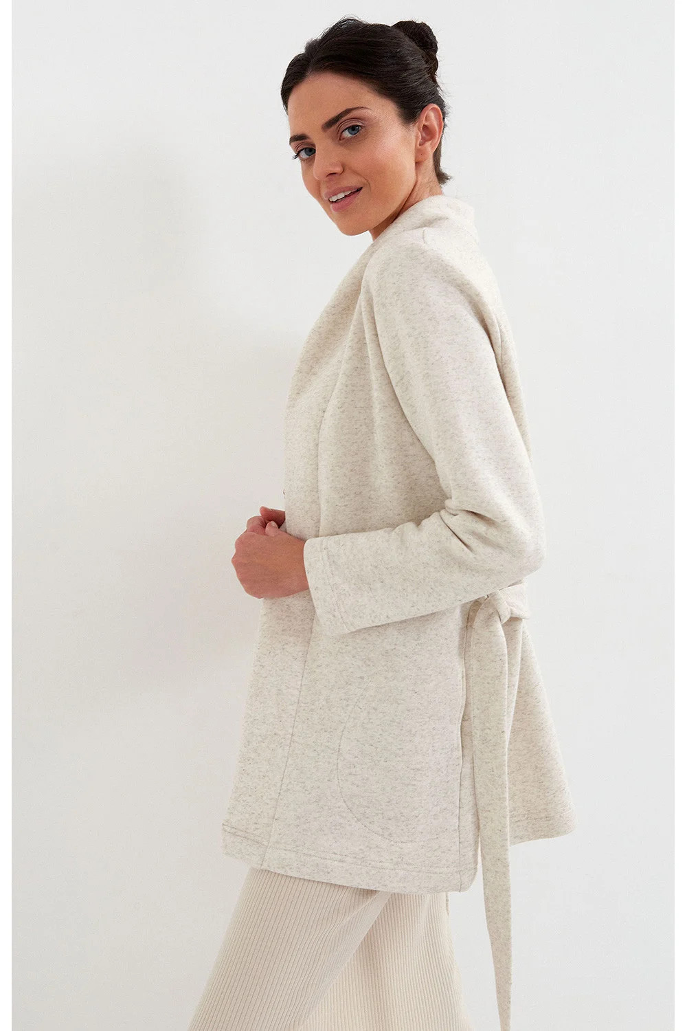 Dámský župan z hřejivého úpletu s přídavkem lnu, úplet nařasený na vnitřní straně. Župan se šálovým límcem s příjemnou kožešinou. Župan s dlouhými rukávy, praktické nakládané kapsy, zavazování v pase.