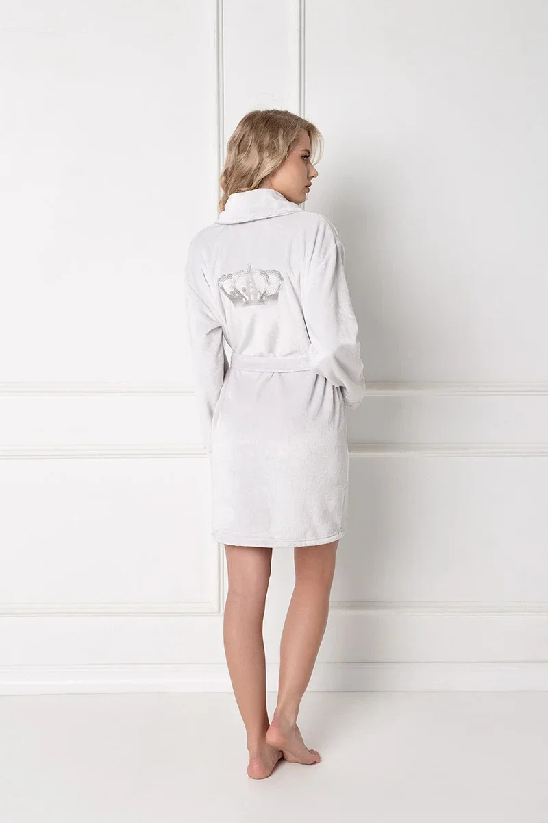 Krásný, velmi ženský dámský župan z nejnovější kolekce Aruelle, který vyniká stylovým saténovým lemováním. Lemování na okrajích límce, kapes a manžet rukávů elegantně dotváří celý design. Na zadní straně je výšivka a korunka. Tady je župan, ve kterém se tak příjemně sedí u ranní kávy. Nabídka pro ženy, které hledají něco výjimečného. Hřejivá, měkká tkanina nejvyšší kvality.