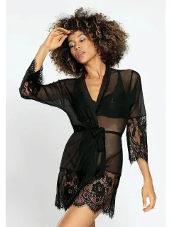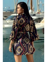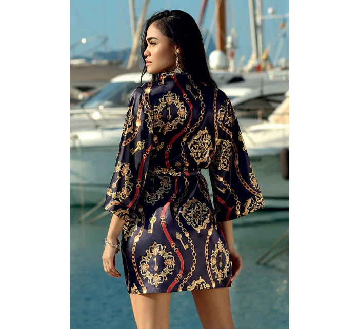 Výrazný, expresivní vzor, tmavší barvy a satén - kombinace, která vás zaujme. Oblečte si tento plášť, kdykoli budete chtít relaxovat. 3/4 rukávy, zavazování v pase, délka do půli stehen. Tak co, ranní káva nebo večer s dobrou knihou? S tímto krytem můžete dělat obojí.