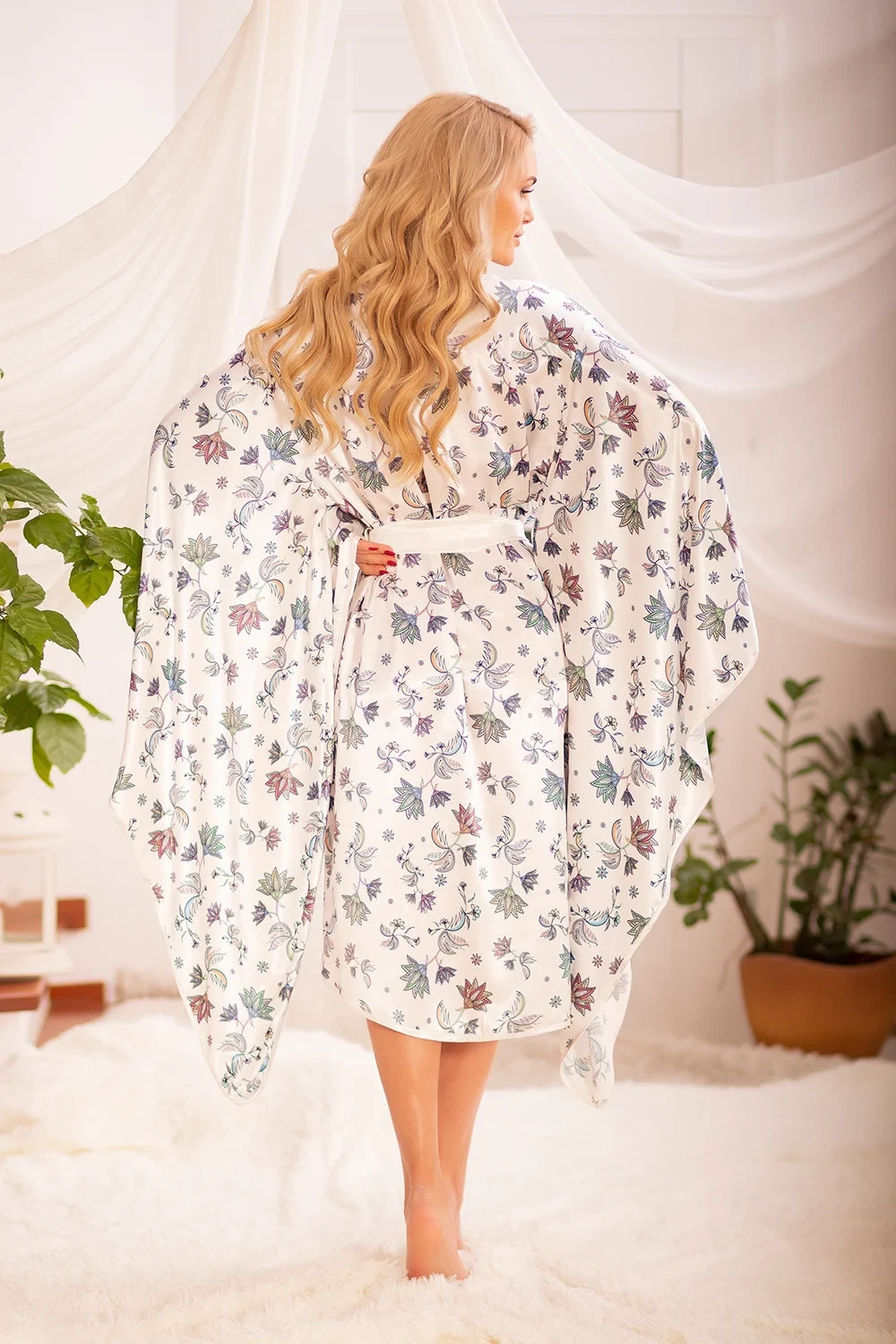 Představte si teplé jarní nebo dokonce letní ráno, tráva zalitá ranní rosou odráží sluneční paprsky a vy, oblečená do barevného, jemného negližé, otevíráte okno své ložnice? Tuto náladu nepochybně umocní saténové negližé Hulhule, jehož látku rovněž navrhli přátelé Kalimo. Negližé je navrženo tak, aby působilo lehce a důstojně, takže se můžete cítit jako barevný motýl. Budete okouzleni? Široké rukávy sahající do půli lýtek upoutají pozornost. Tento přehoz můžete použít také jako přehoz na plavky na dovolenou. Spodní prádlo je zabaleno v krásné velké krabici (ideální jako dárek).
