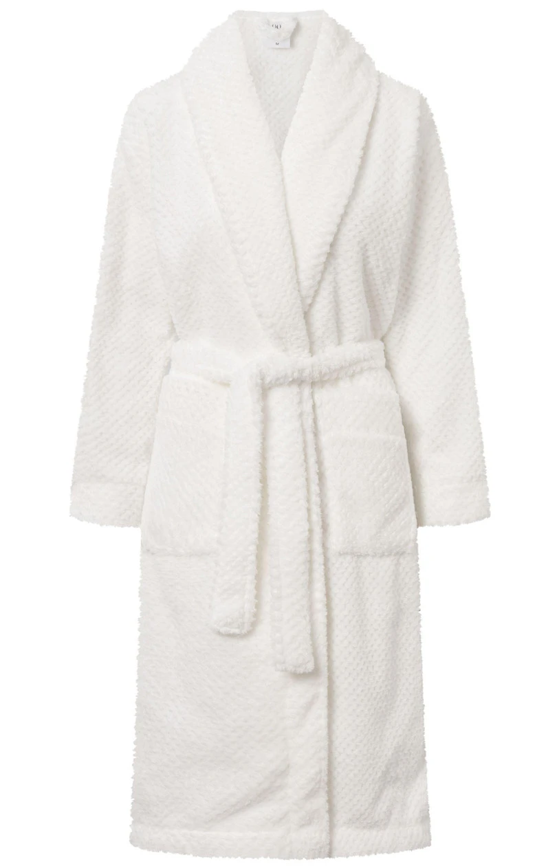 Měkký župan volného, pohodlného střihu s dlouhými rukávy. Šaty se zavazováním v pase.