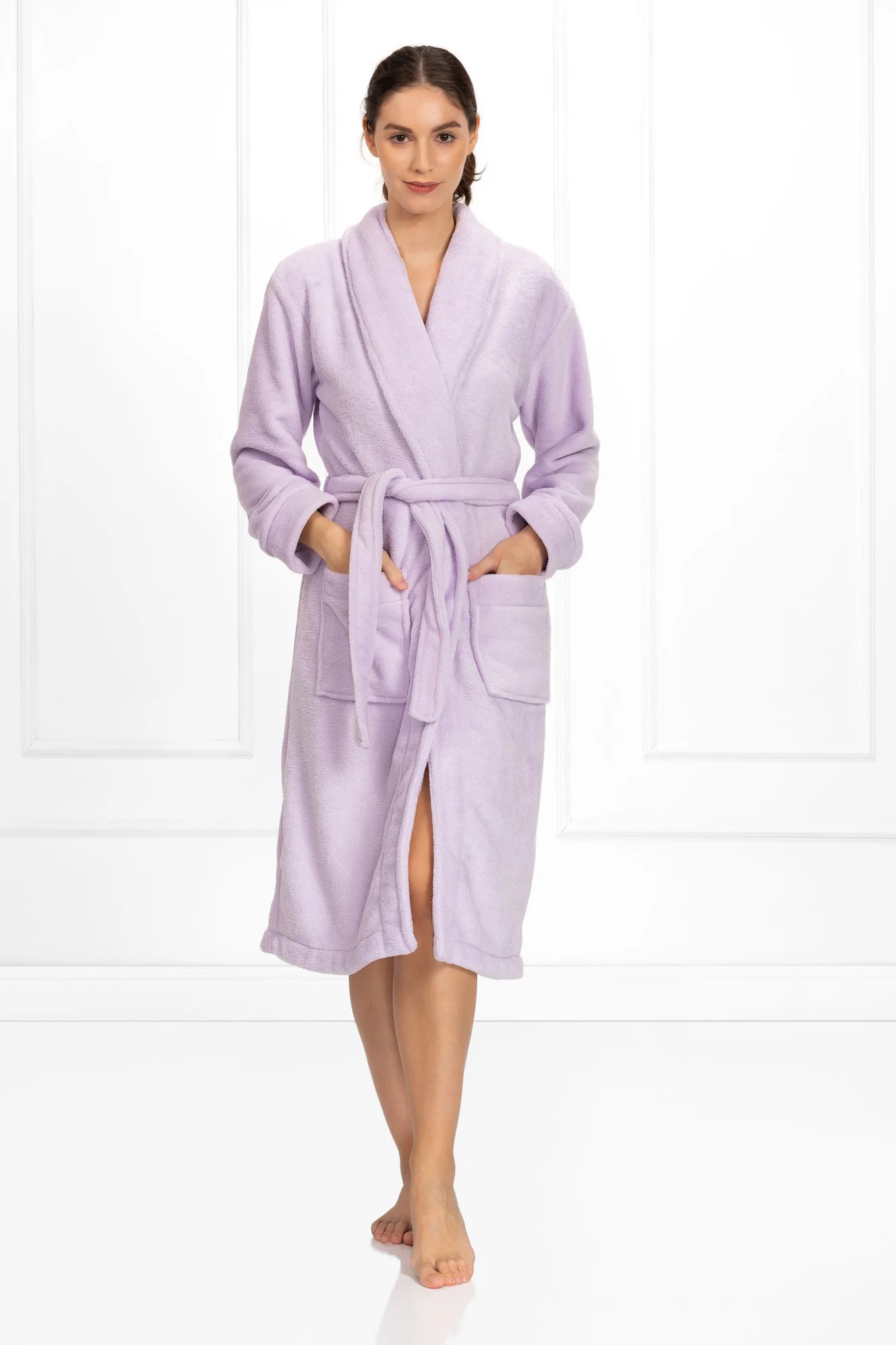 Paloma je stylový dámský župan v jemném fialovém odstínu. Spodní sukně je zdobená elegantními lemy. Model má dlouhé rukávy, kapsy na bocích a zavazování v pase. Střih se stylovým límcem (bez kapuce). Ideální dárkové balení. Polský výrobek. Vysoká kvalita.