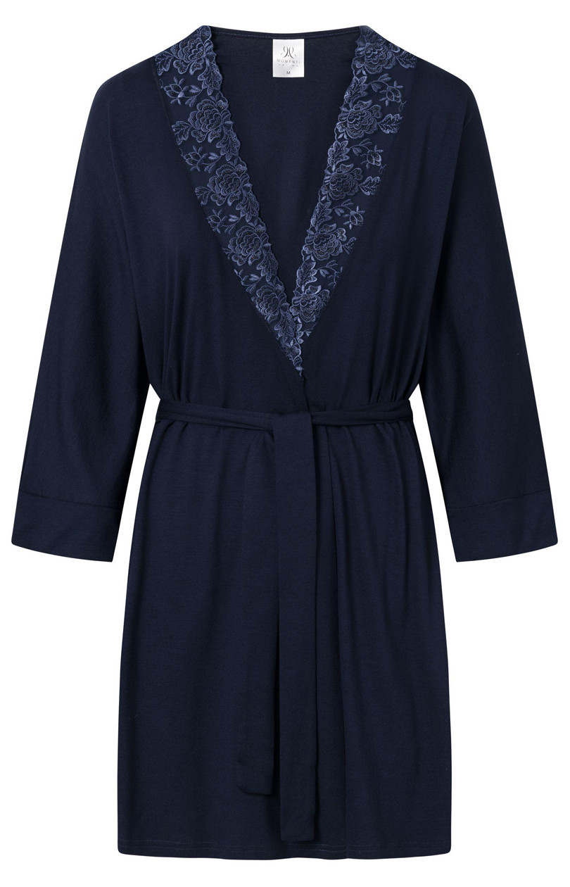 Luxusní dámský župan z měkké a jemné viskózy. Krásné spodní prádlo, které je ideální pro každou situaci. Župan se v pase zavazuje přiloženým páskem. Volné rukávy v délce 3/4. Výrazným prvkem je krásně zdobený výstřih z ažurové krajky s květinovým motivem. Spodní prádlo v délce do poloviny stehen. Velmi pohodlný materiál, jemný jako mlha a velmi příjemný na dotek. Vysoká kvalita výrobku.