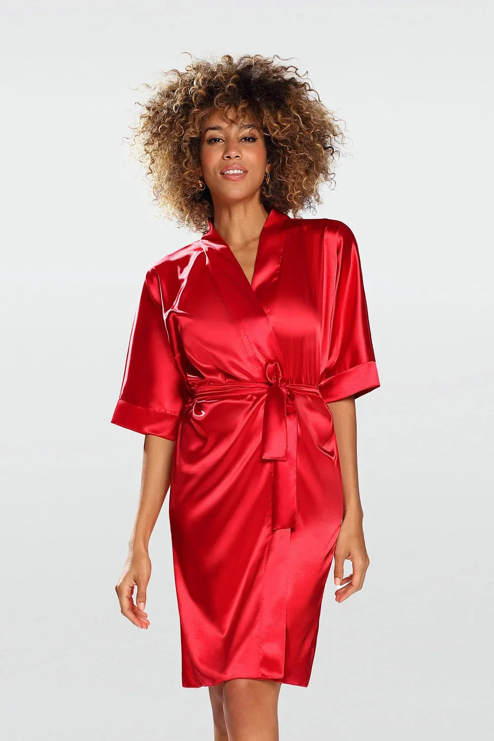 Župan s krátkými rukávy z elastického saténu. Župan má volný, pohodlný střih se zavazováním v pase. Polyester 100 %