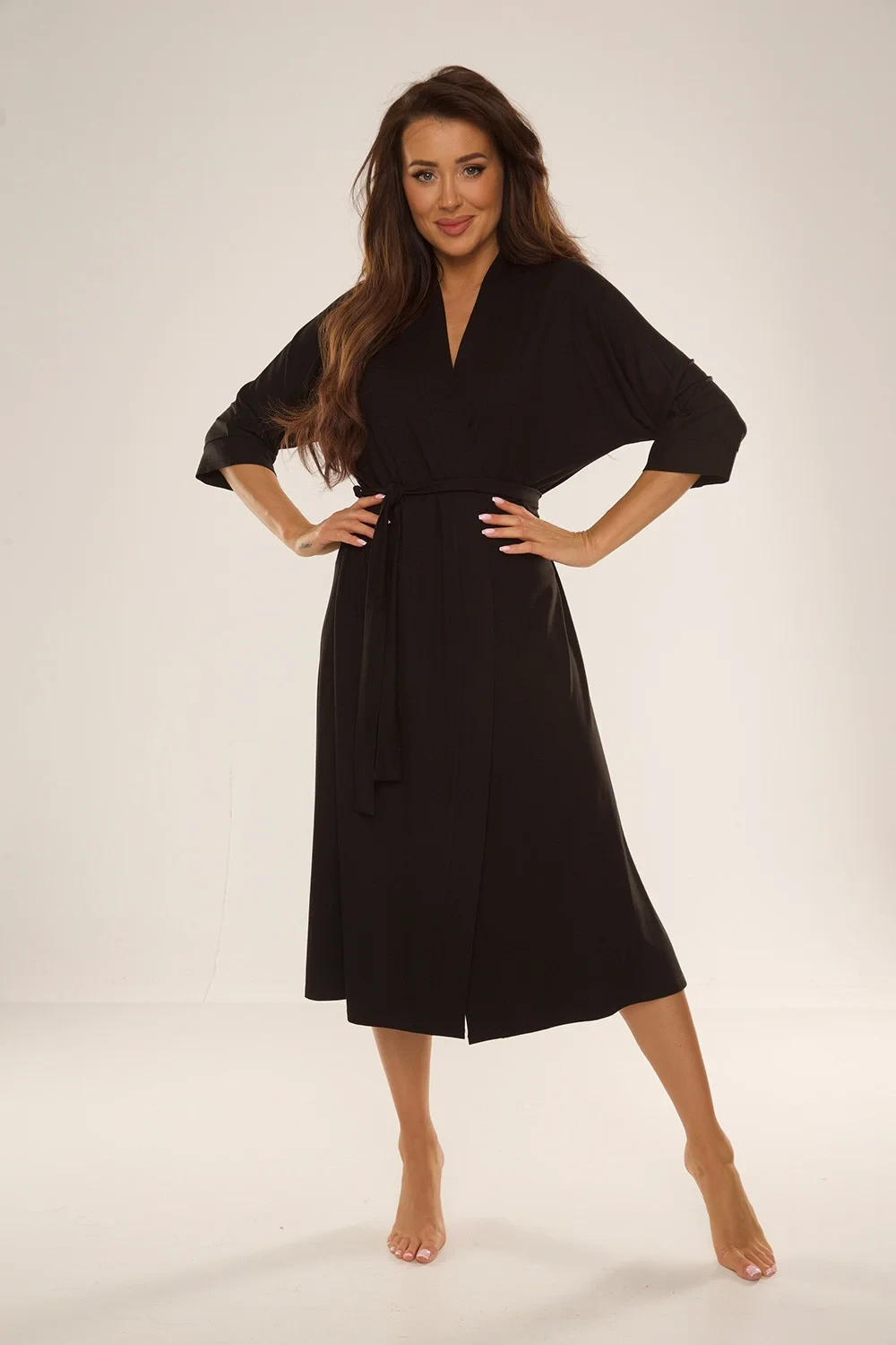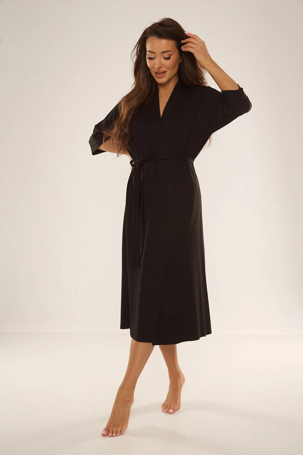 Pohodlný dlouhý dámský župan. Vyroben z vysoce kvalitního viskózového materiálu s přídavkem lycry. Dodává pocit pohodlí a volnosti. Model s praktickým vázáním v pase. Rukávy 3/4, s jemným rozparkem ve švu. Chcete se cítit módně a stylově? Tento župan je pro vás ten pravý. Pohodlí a měkkost dodají vaší ranní kávě lahodnou chuť.