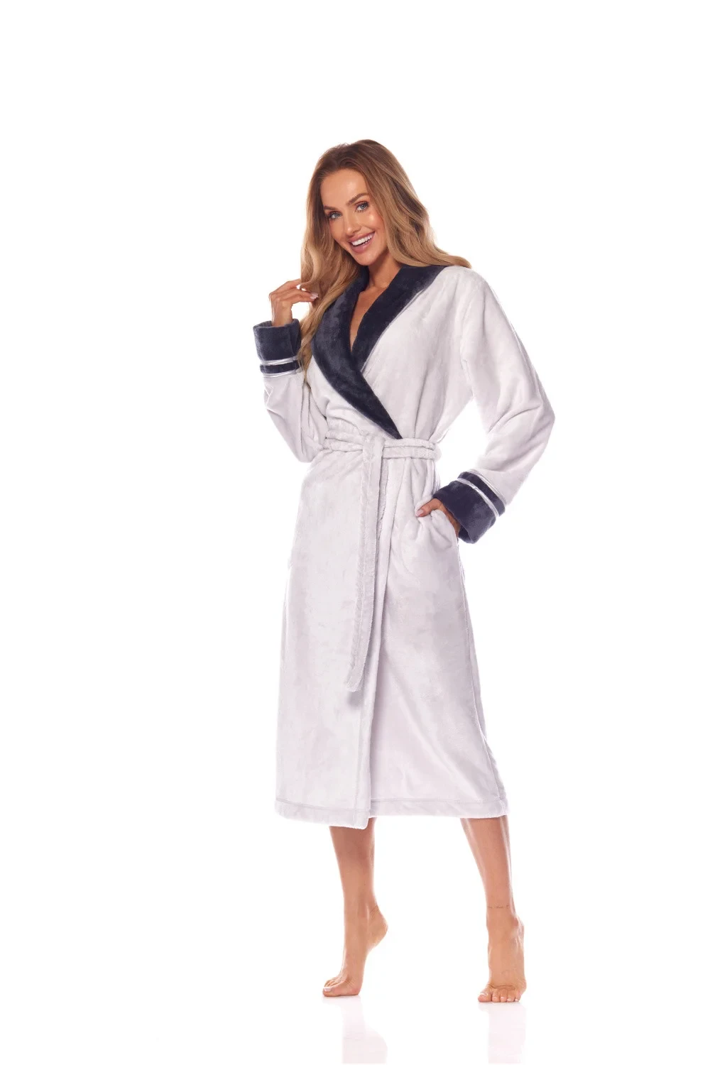 Představujeme elegantní ženský župan, který okouzluje svým stylizovaným vzhledem a vysokou kvalitou zpracování. Vyrobena z měkké a prodyšné látky, zajistí vynikající pohodlí při nošení jak doma, tak při relaxaci. Elegantní dokončení s pipingem dodávají šik a volný střih a boční kapsy dodávají funkcionalitu. Dlouhý rukáv s manžetami a zapínání na pás umožňuje dokonalé přizpůsobení postavě. Župan je balen v elegantní tašce, což z něj činí ideální dárek. Polský výrobek, vytvořený s pečlivostí každého detailu.