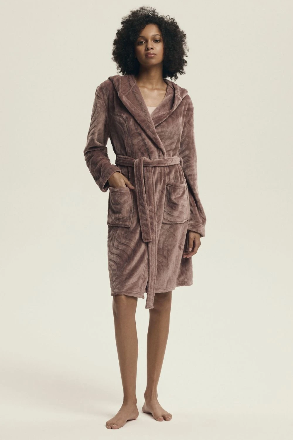 Měkký a pohodlný župan pro ženy s volným střihem, ideální pro domácí relaxaci. Vyrobený z příjemné látky s tisknutým vzorem, který mu dodává jemný ženský charakter. Model má kapuci, praktické kapsy a šněrování v pase, které umožňuje přizpůsobení postavě. Délka po kolena zajišťuje pohodlné nošení a celý župan je balen v plastovém sáčku, což ho činí skvělým dárkem.