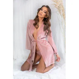 Okouzlující velurový župan s krajkovou a tylovou vsadkou na zádech v krásné pudrově růžové barvě. Zavazování v pase. Měkká tkanina s jemným perleťovým leskem. složení: 100% polyester.