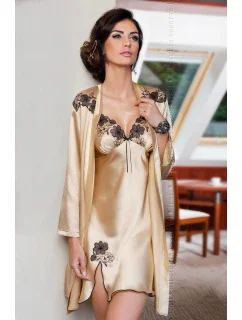 Elegantní saténový župan v jedinečné šampaňské barvě, vyrobený z nejkvalitnější italské tkaniny s krásným jemným leskem, s rameny zdobenými ručně vyšívanou výšivkou v černé barvě, se zavazováním v pase. Jeden z nejkrásnějších návrhů značky Irall. 100% polyester.