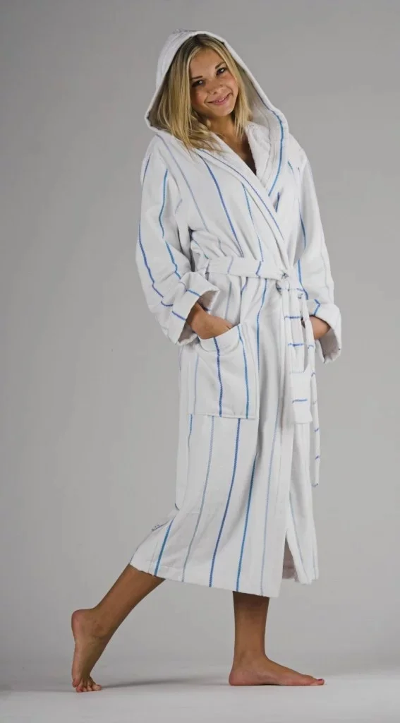 Proužkovaný župan s kapucí, délka pod kolena, velké kapsy, zavazování na pásek. Materiál: 100%Bavlna, velur 420g/m2