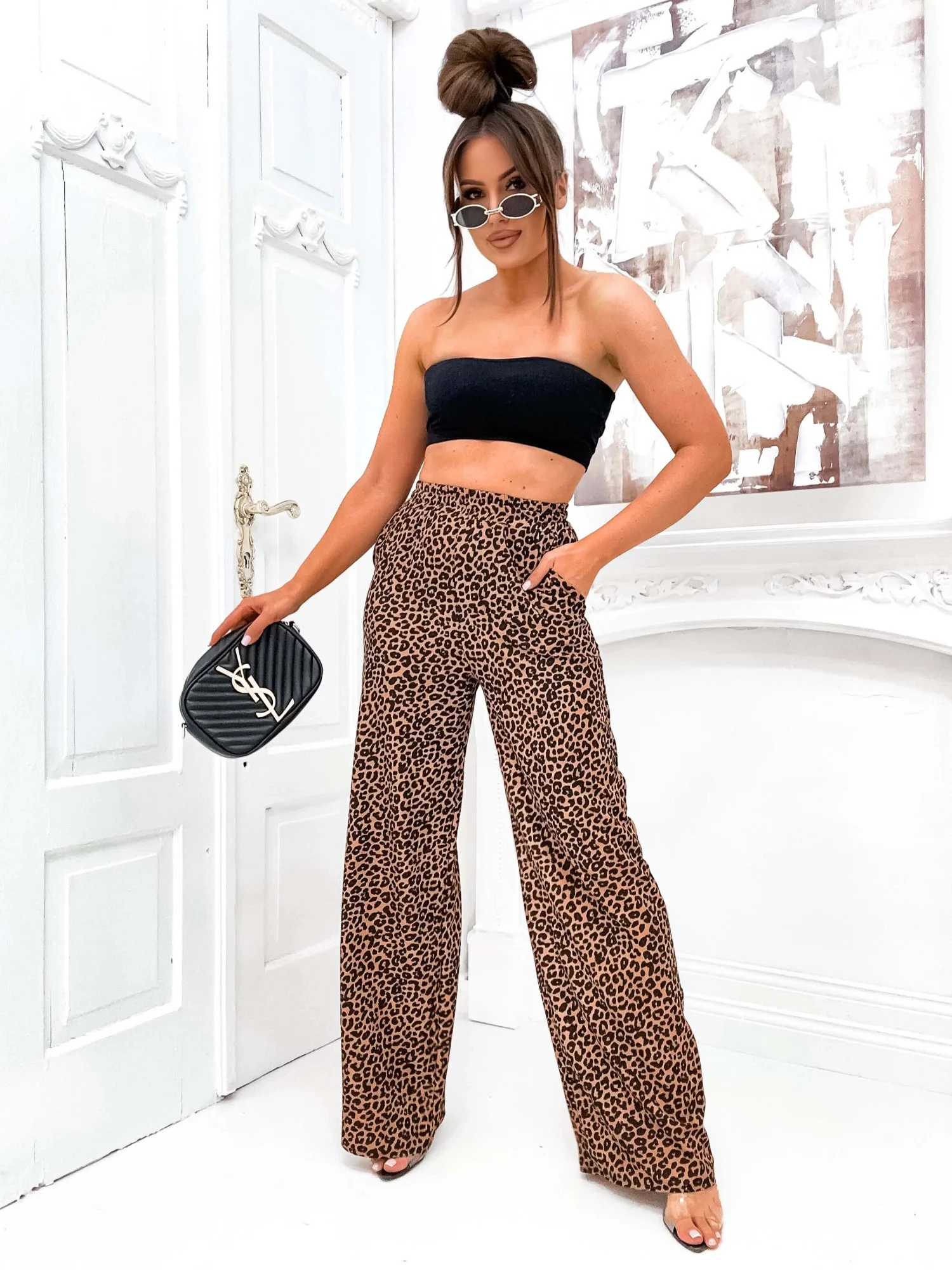Zwiewne spodnie damskie w gumkę brązowo-czarna panterka (82197)